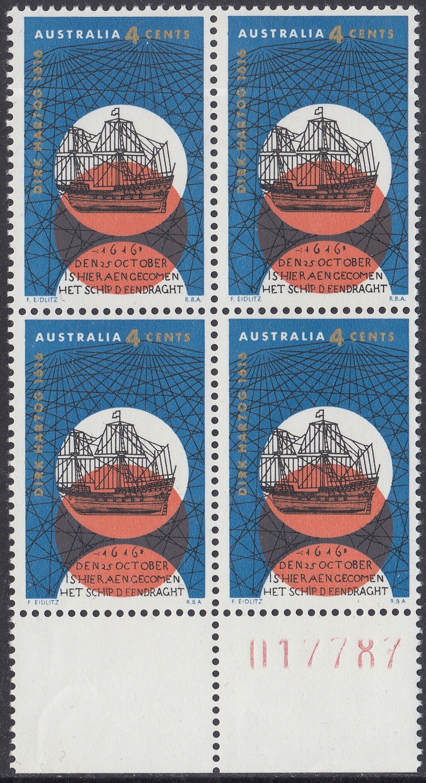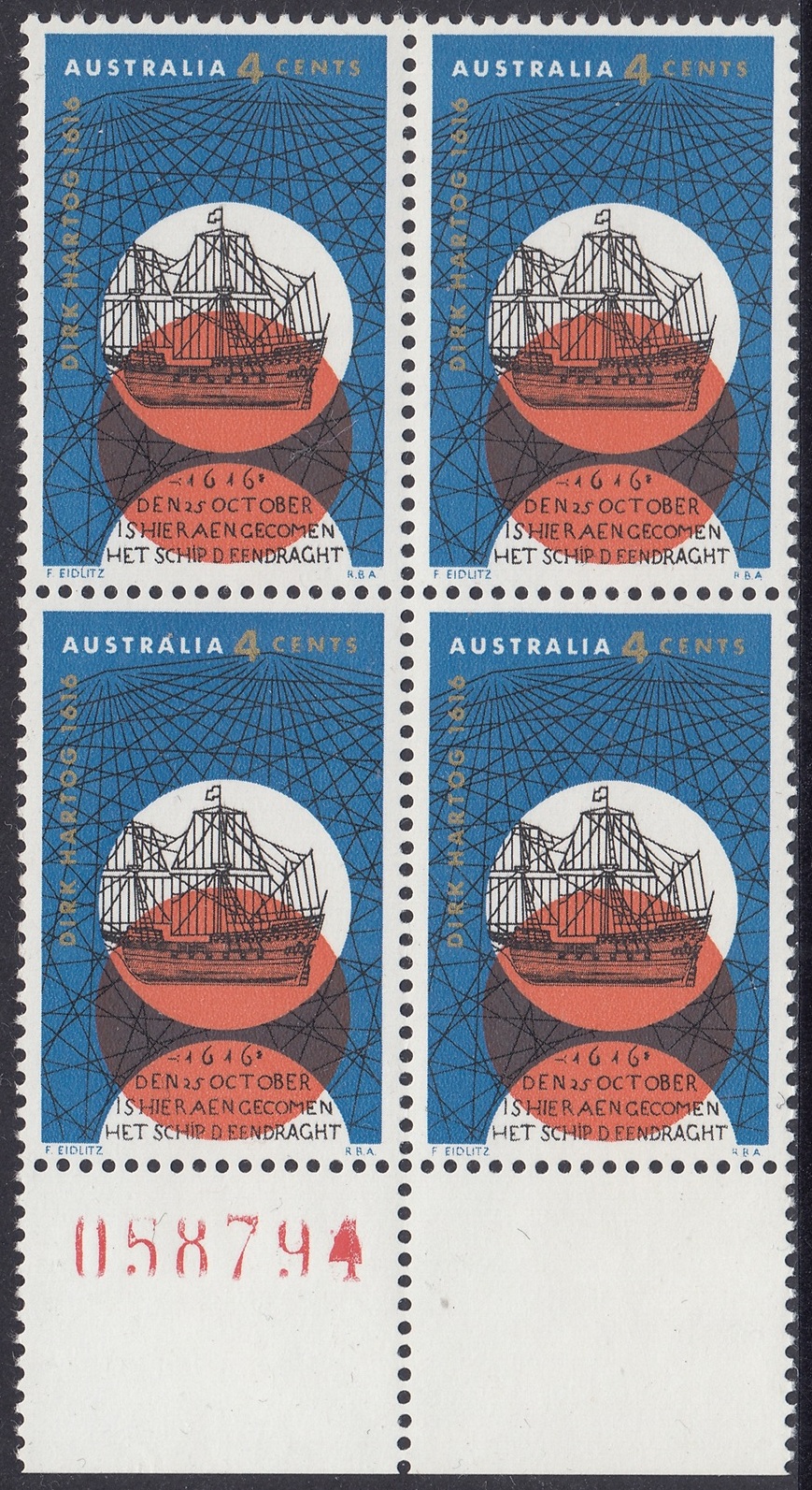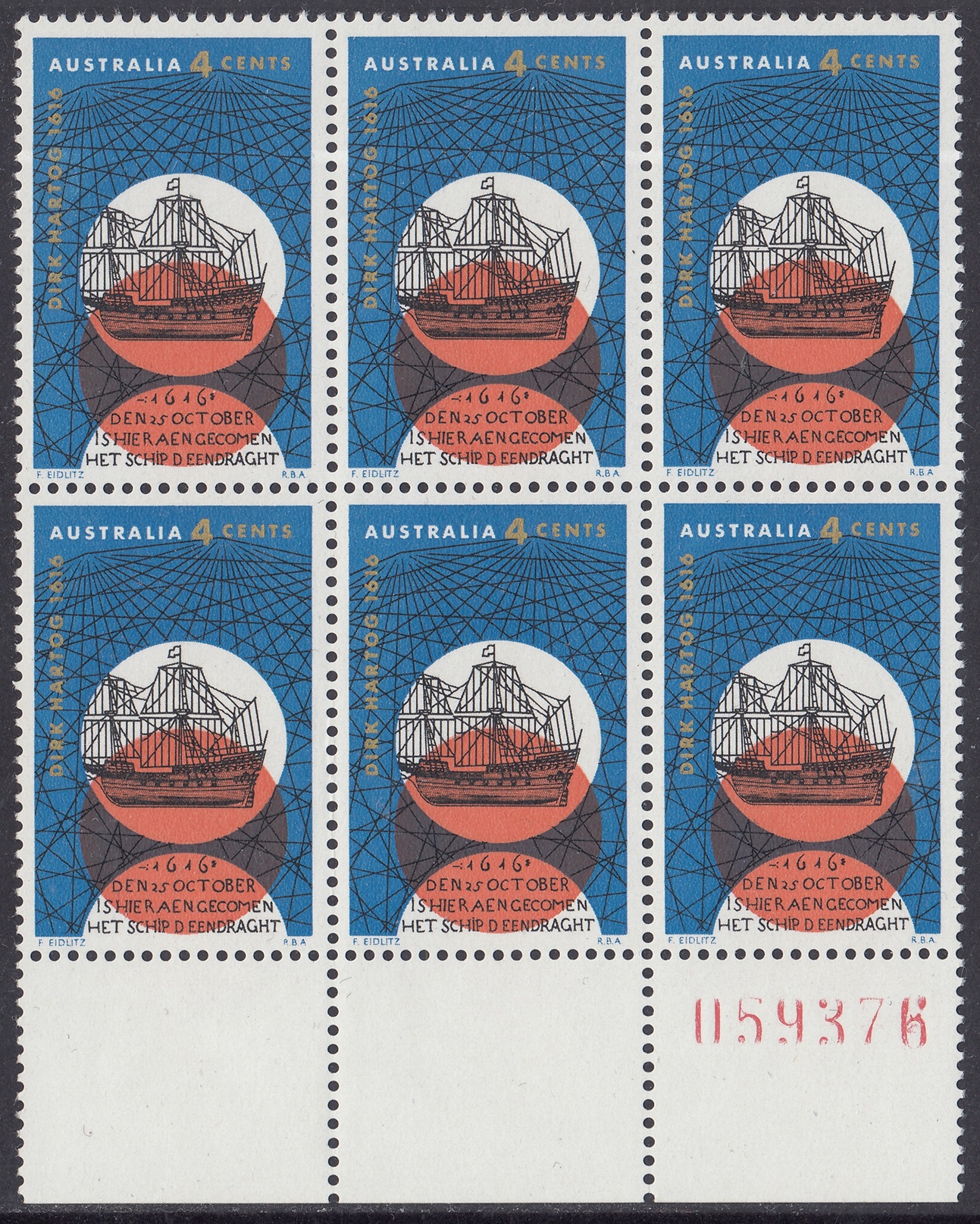 The designed is illustrated. Colours are : background blue; ship, rhumb lines and lettering on plaque black; circle orange-red; “Dirk Hartog 1616” and “4 CENTS” gold. Design size is 22 mm x 34.5 mm, and sheet content is 48.