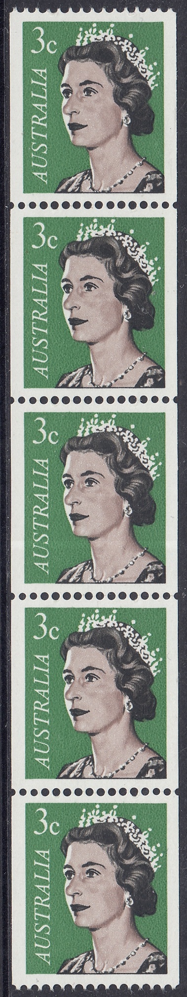 Previous coils have been made up from various stamps printed in sheets, then separated into vertical rows and joined up into continuous coils. The joints occuring every 20 stamps had a tendency to cause faults in vending machines, and the decision was therefore made to produce soil stamps on the photogravure press, whichs on a continious reel of paper and this obviates the necessity to make joints.