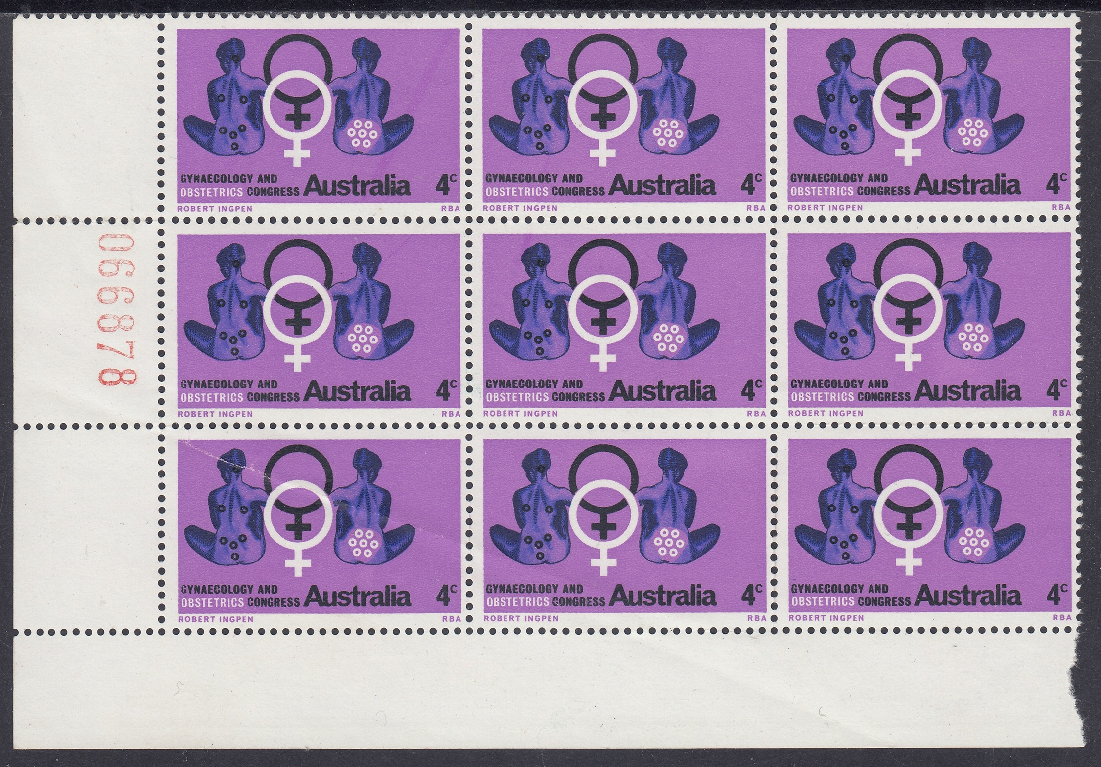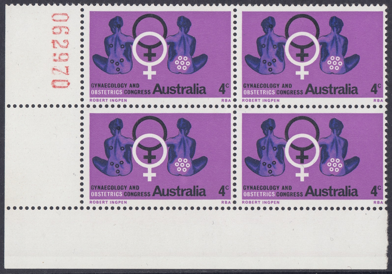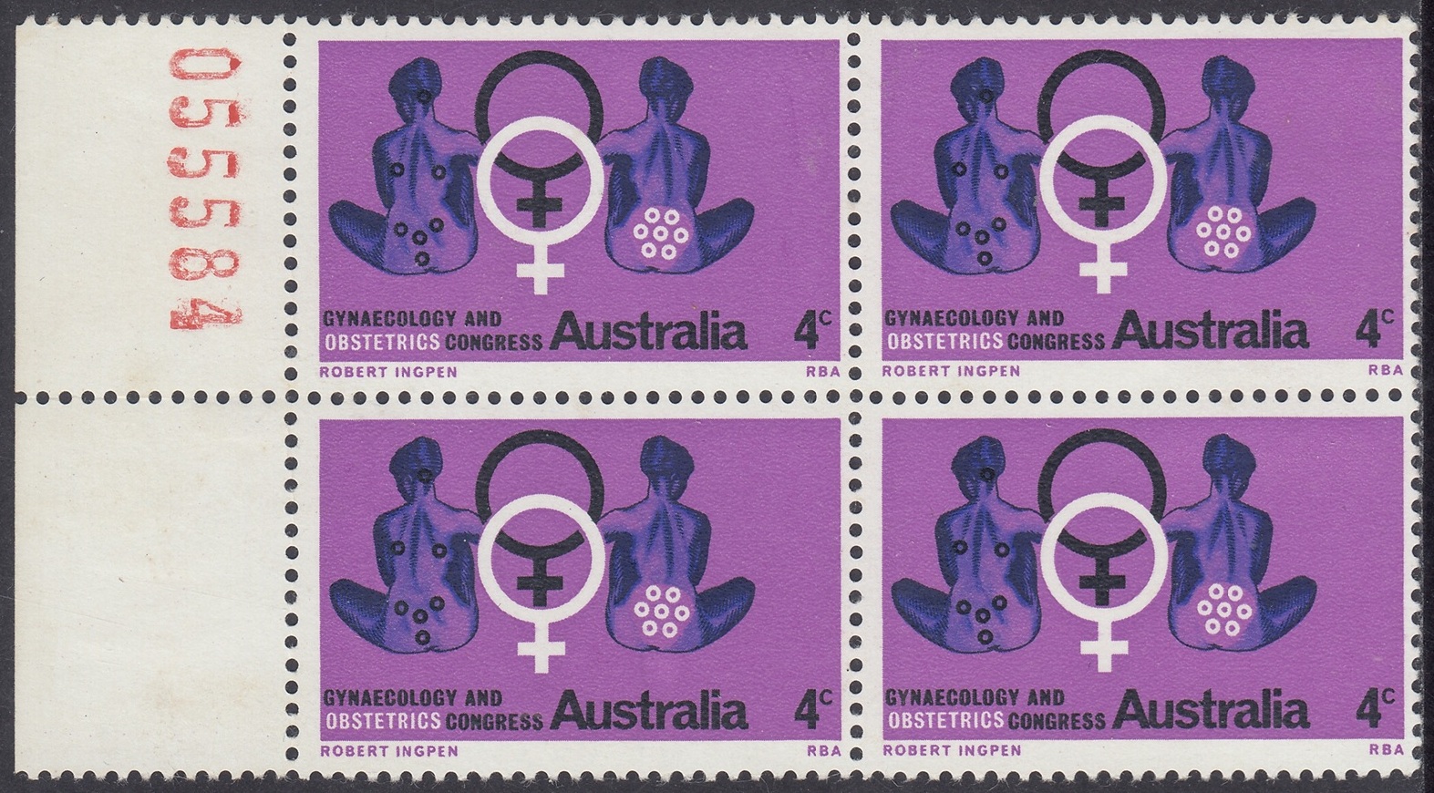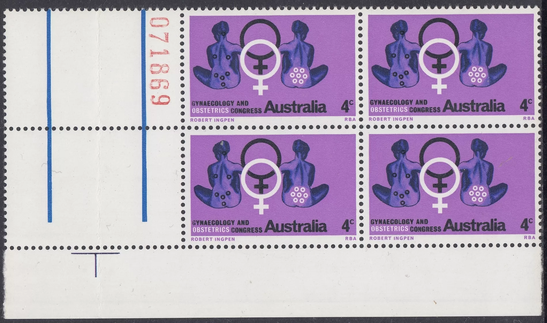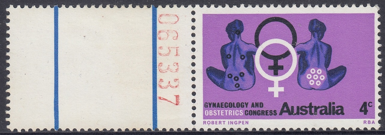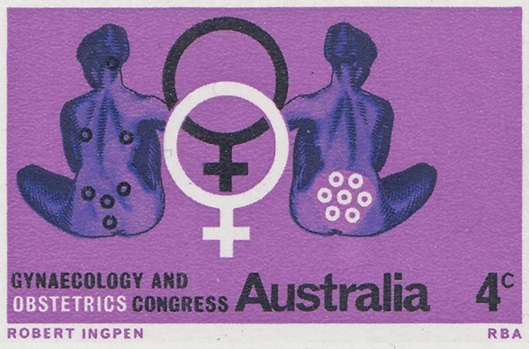 The stamp design, by Mr. Robert Ingpen of Melbourne, shows two seated female figures in an anatomy textbook style; on the figure at left, black circles indicate areas related to gynaecology, and on the right-hand figure white circles show the areas related to obstetrics. Between the two figure, the universal medical and biologocial symnbol for “female” is shown twice with the white symbol superimposed on the black to emphasize medical science’s desire for good health to prevail. The black and white relationships are repeated in the caption; “GYNAECOLOGY” is in black, and “OBSTETRICS” in white, to relate the words to their respective anatomical areas. The human figures are printed in blue and indigo, and the background is light reddish violet.