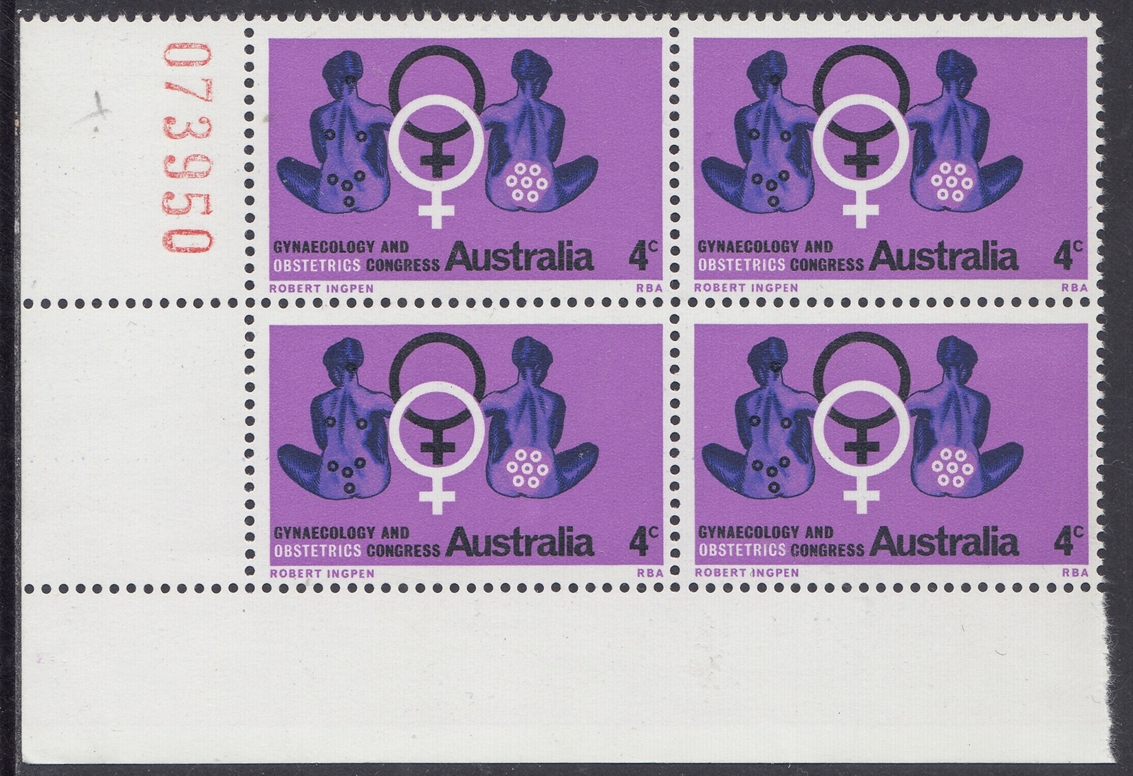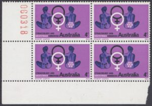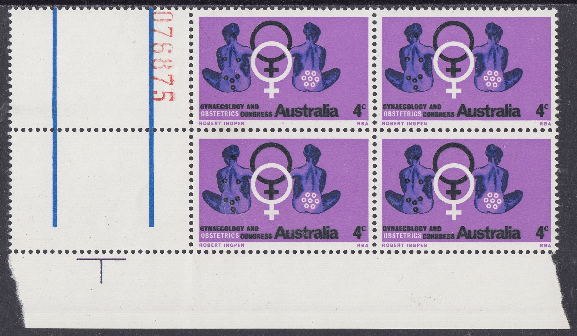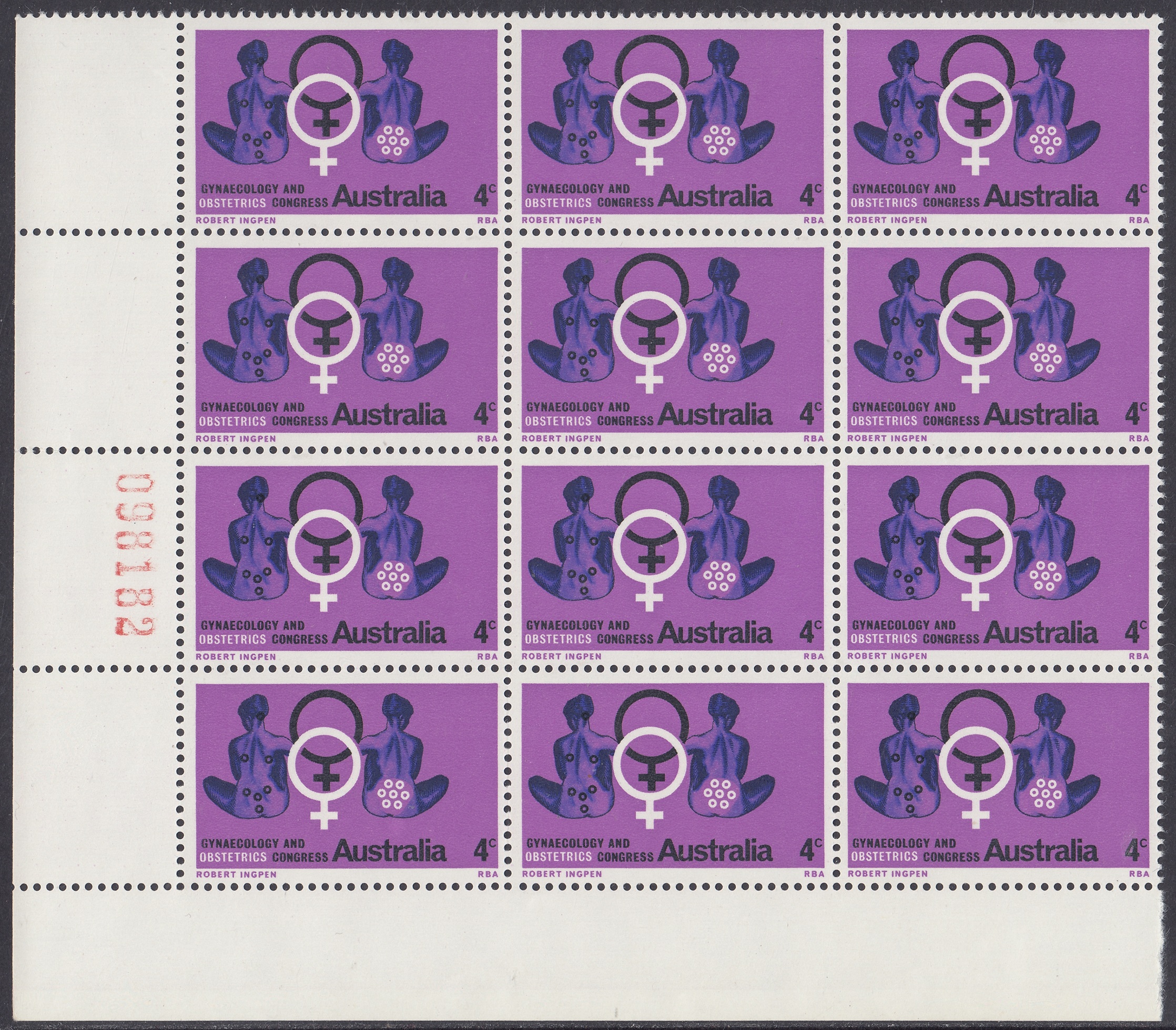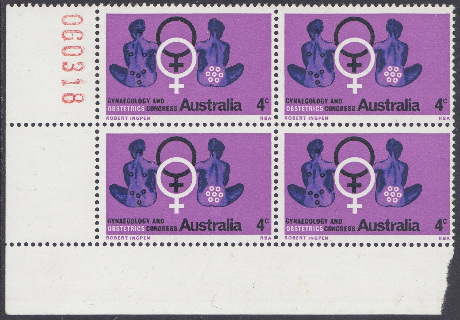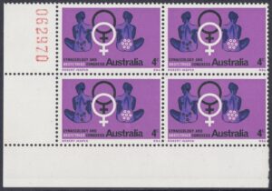 The stamp design, by Mr. Robert Ingpen of Melbourne, shows two seated female figures in an anatomy textbook style; on the figure at left, black circles indicate areas related to gynaecology, and on the right-hand figure white circles show the areas related to obstetrics. Between the two figure, the universal medical and biologocial symnbol for “female” is shown twice with the white symbol superimposed on the black to emphasize medical science’s desire for good health to prevail. The black and white relationships are repeated in the caption; “GYNAECOLOGY” is in black, and “OBSTETRICS” in white, to relate the words to their respective anatomical areas. The human figures are printed in blue and indigo, and the background is light reddish violet.