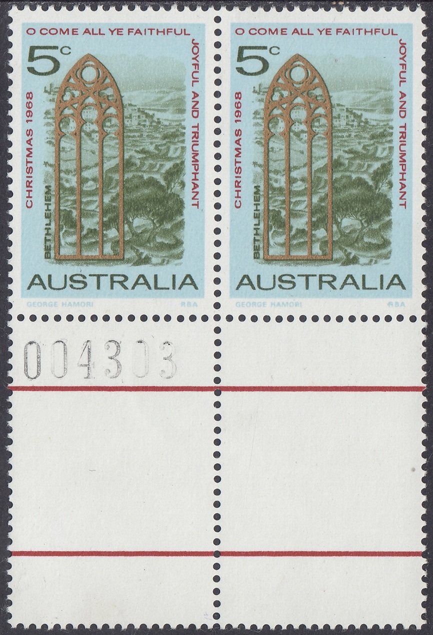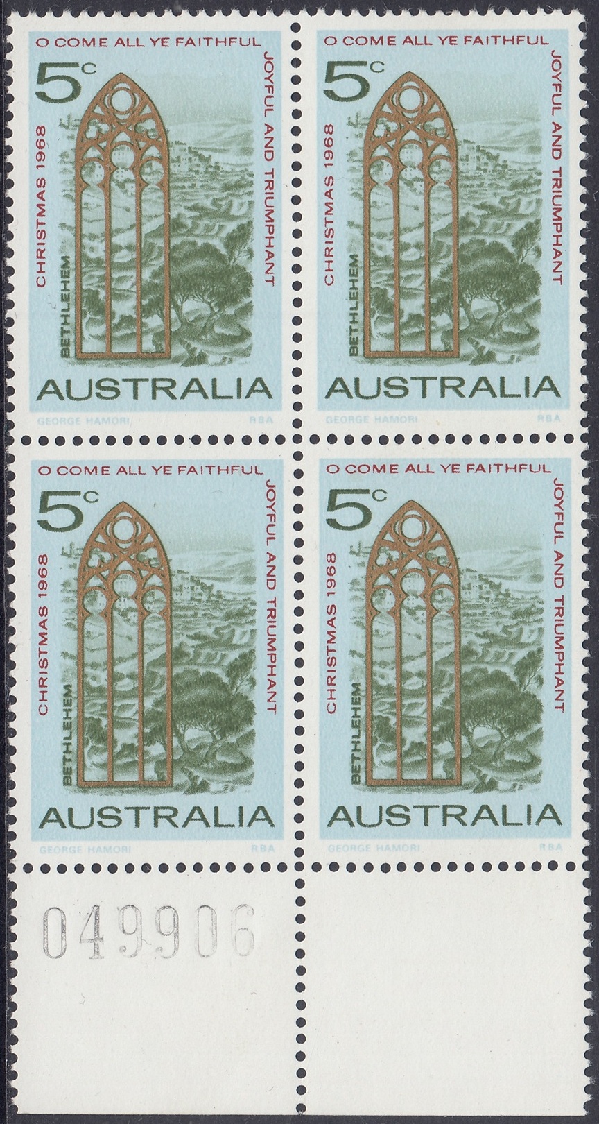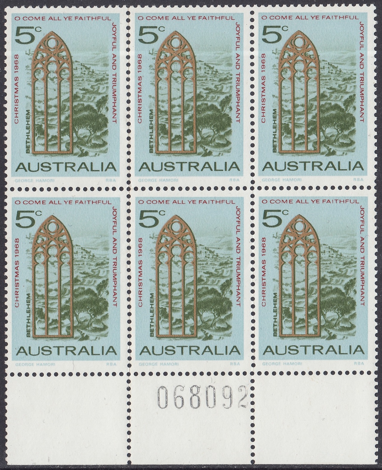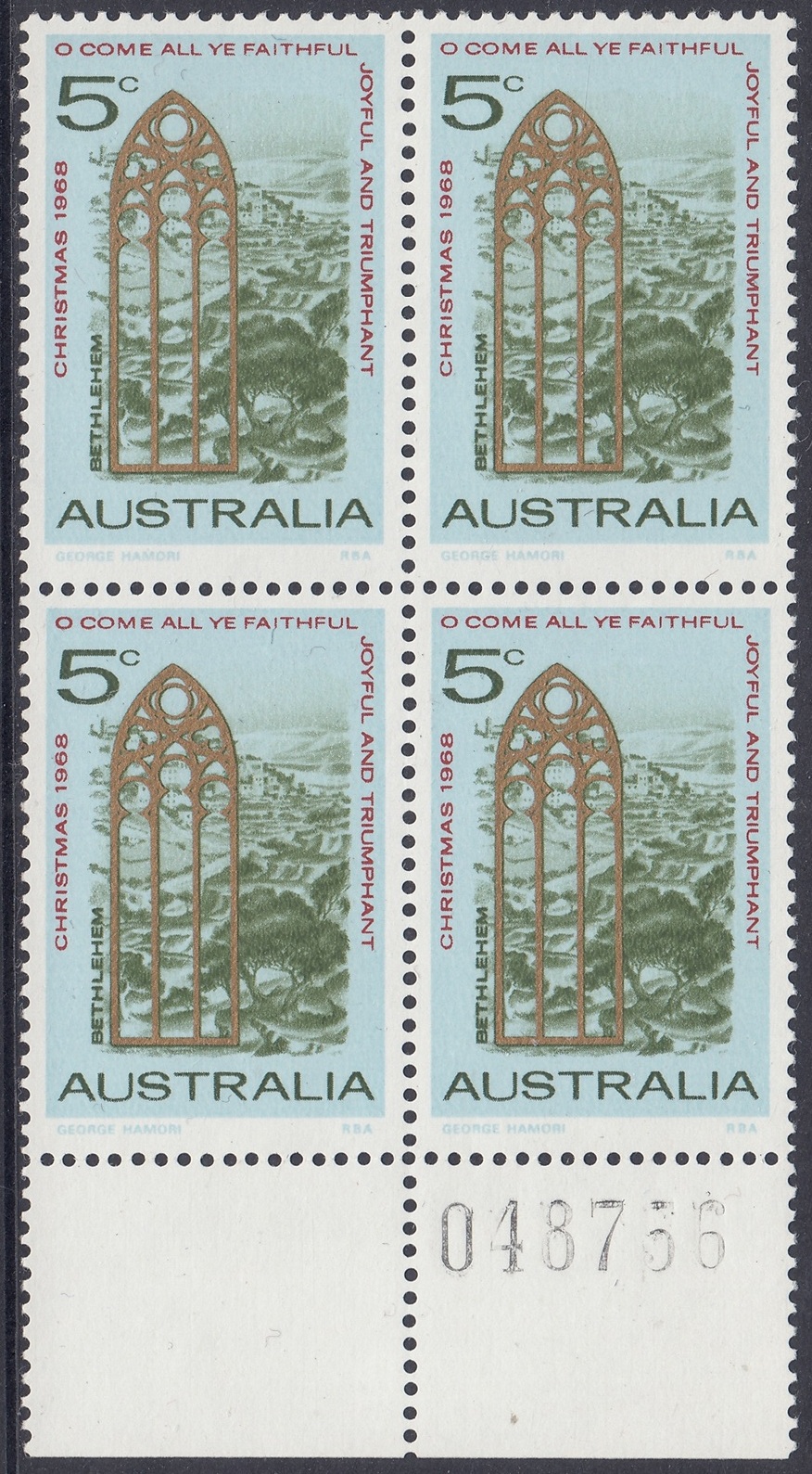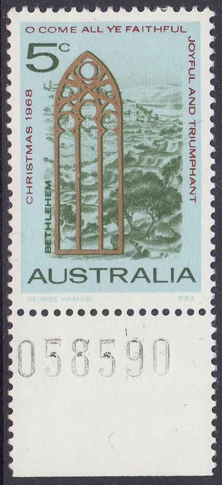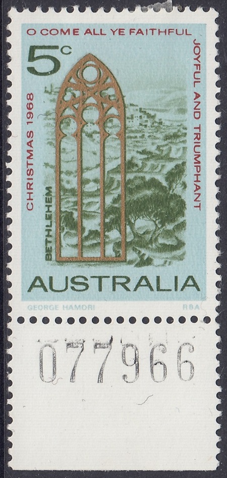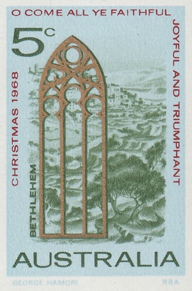 This year’s 5c Christmas stamp was issued on 23rd October, 1968. The approved design was by Mr. George Hamori, of Sydney, and shows a scene of the flat-roofed houses and olive groves of Bethlehem as it might have appeared at the time of the Nativity; on this is superimposed a Gothic window. The colours (in printing order) are: light blue background, dark green scene, red marginal lettering, and gold window. “AUSTRALIA” and “5c” are in green.