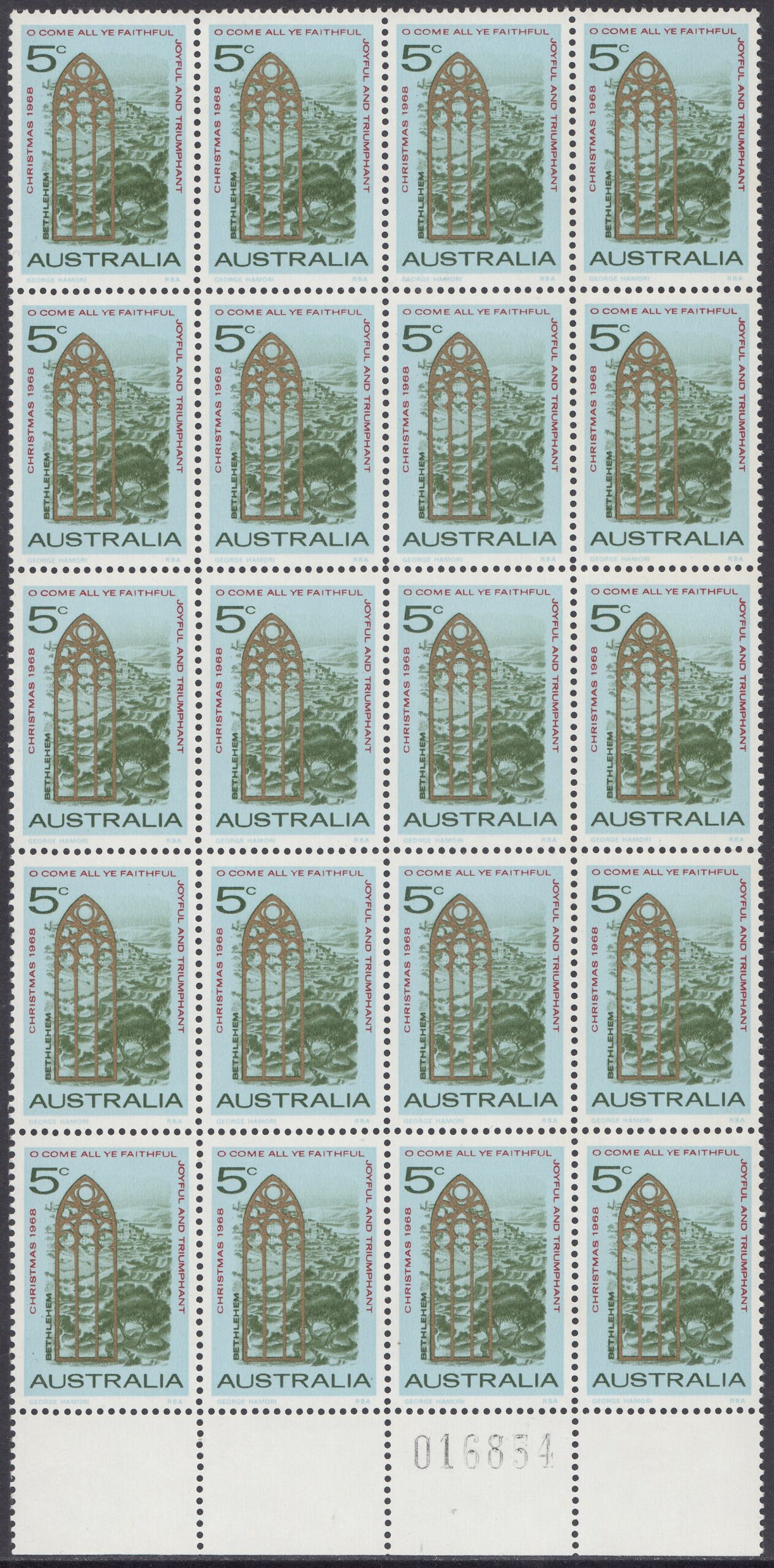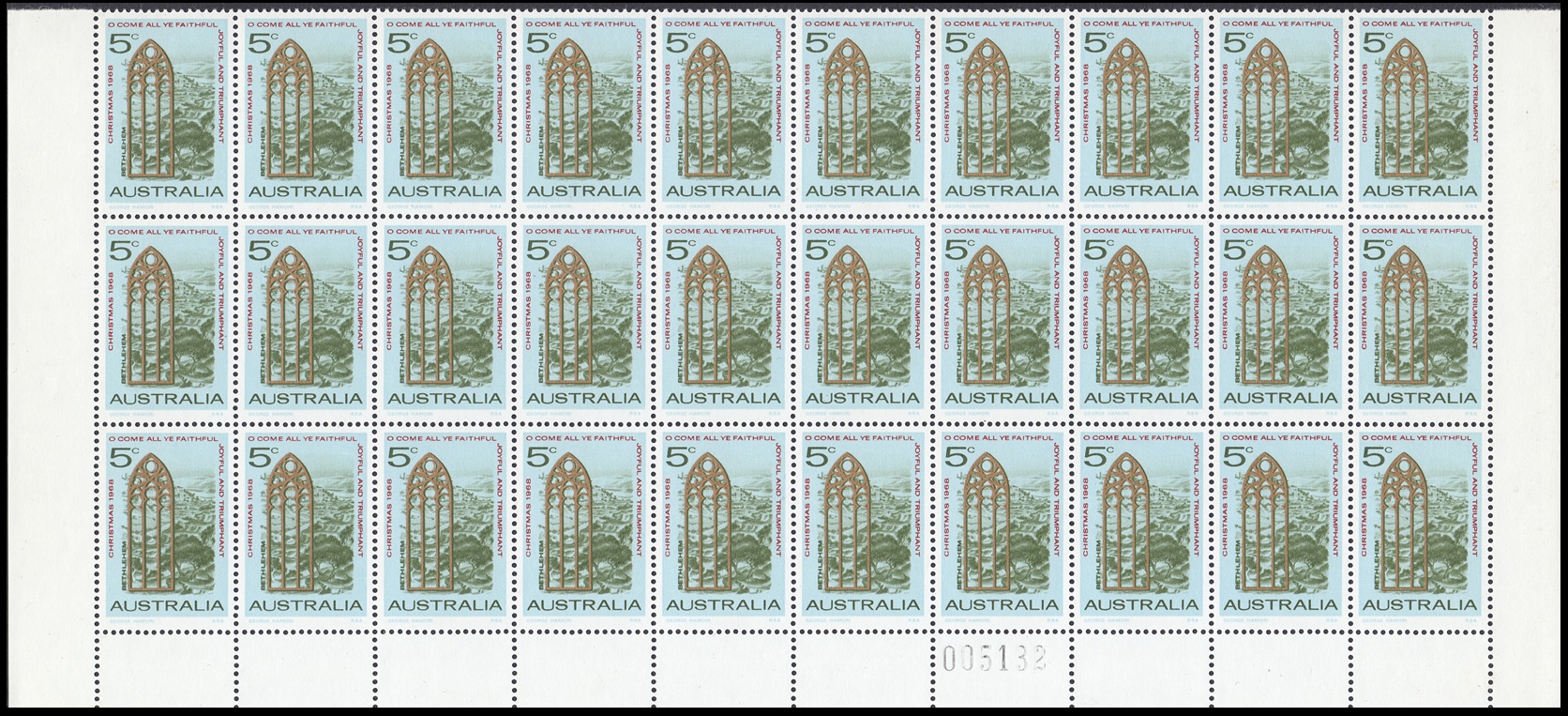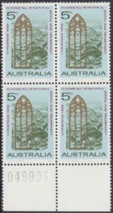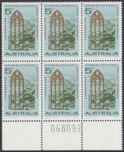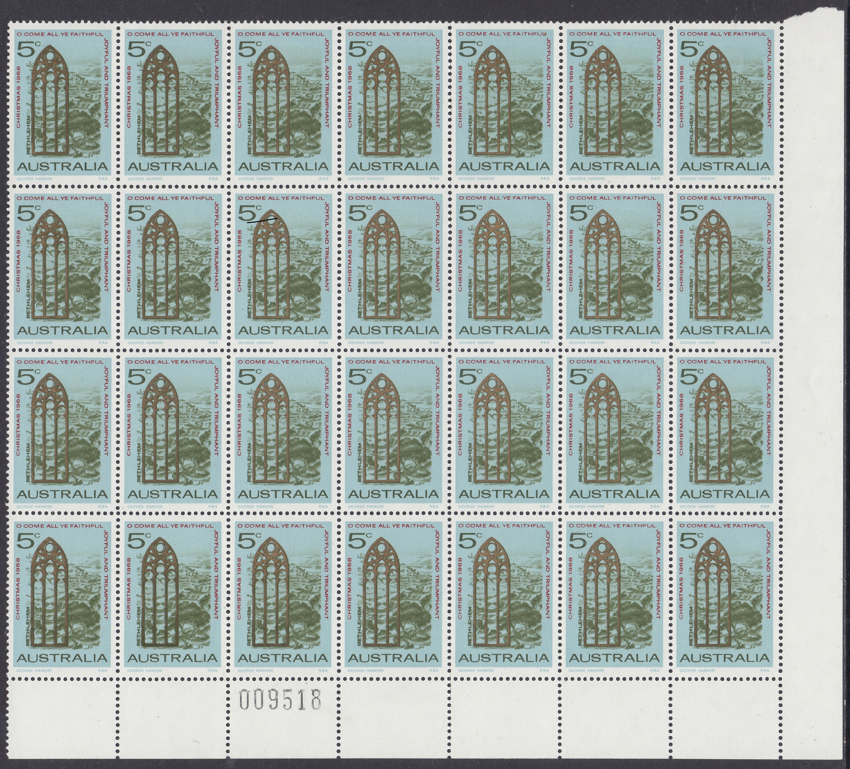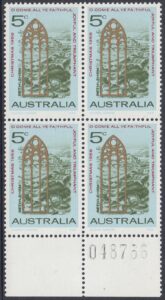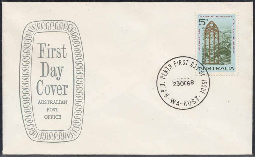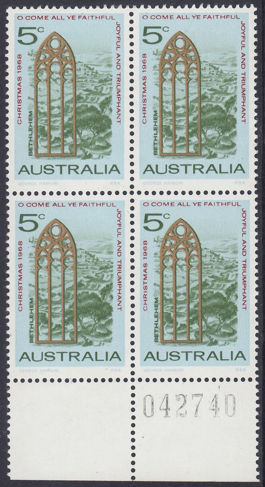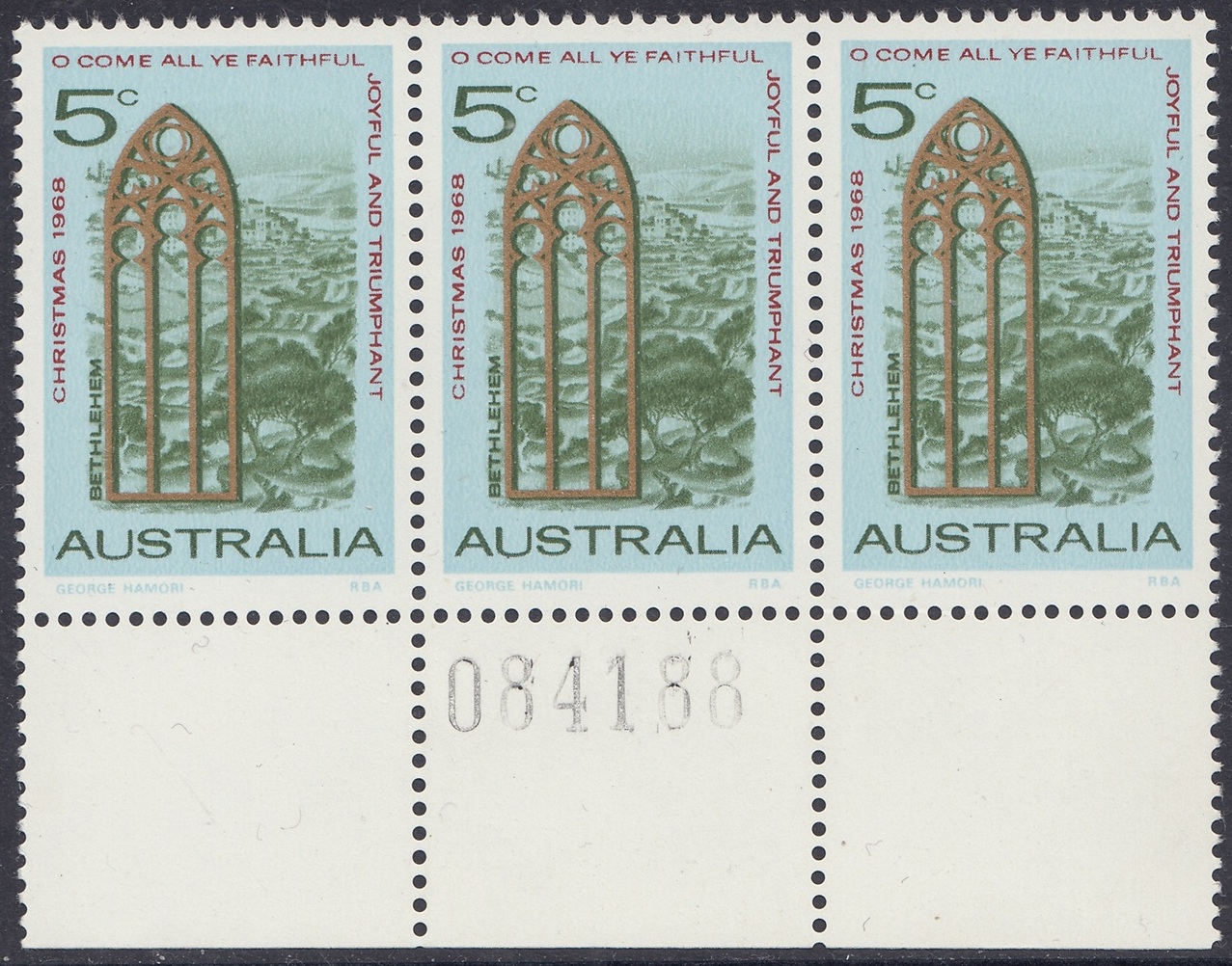 This year’s 5c Christmas stamp was issued on 23rd October, 1968. The approved design was by Mr. George Hamori, of Sydney, and shows a scene of the flat-roofed houses and olive groves of Bethlehem as it might have appeared at the time of the Nativity; on this is superimposed a Gothic window. The colours (in printing order) are: light blue background, dark green scene, red marginal lettering, and gold window. “AUSTRALIA” and “5c” are in green.