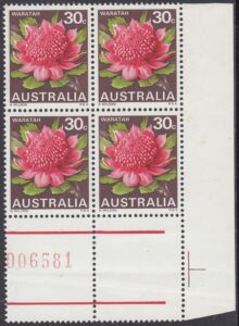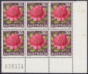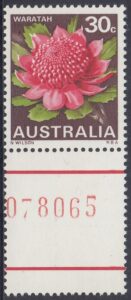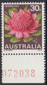Stocks of the 30c Waratah stamp became in short supply at post offices in mid-1971. New printing cylinders had to be made because the original set was unservicable, and the resultant printing shows some colour variations from the earlier stamps. In the new printing greater areas of white are shown in the pink tones of the petals.