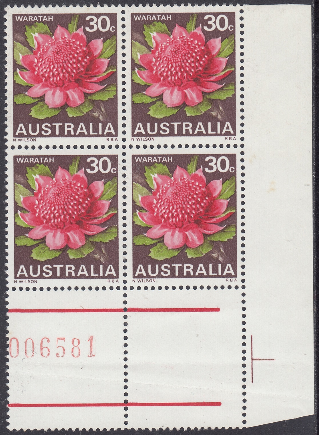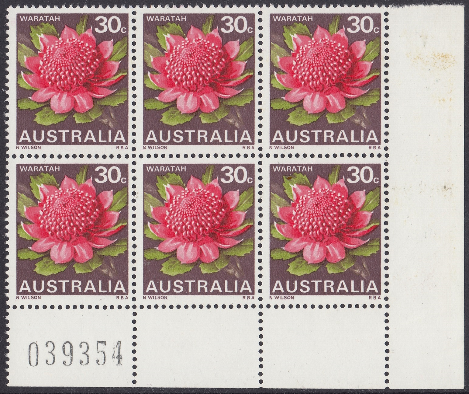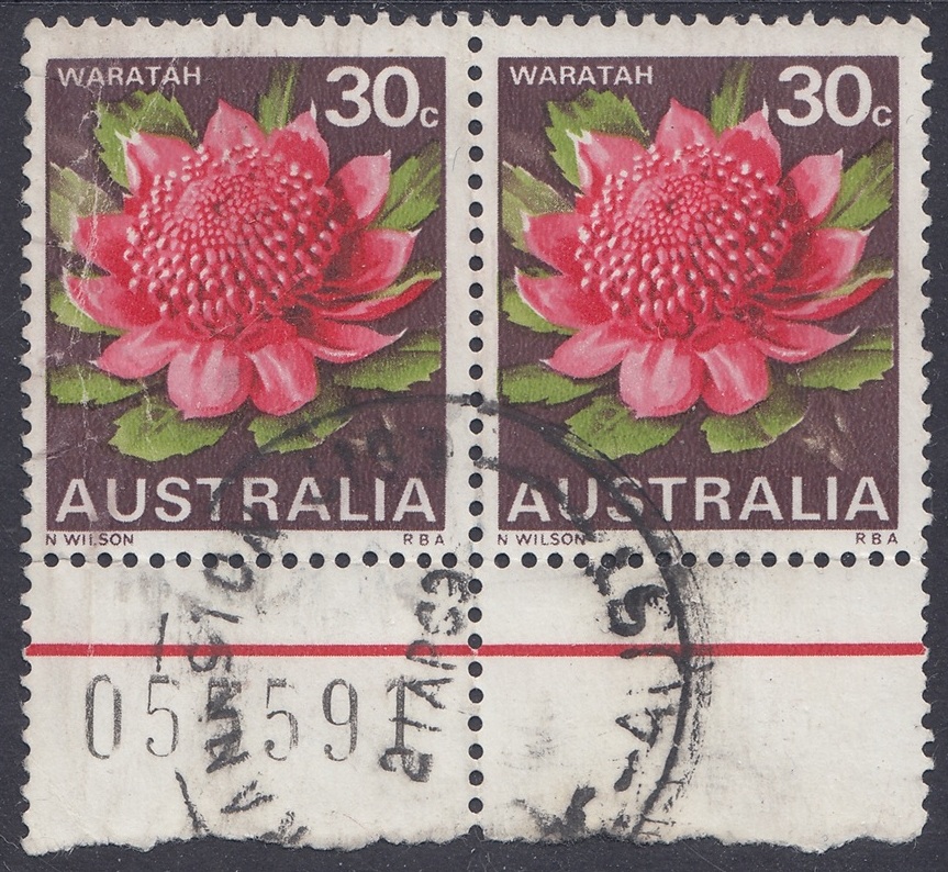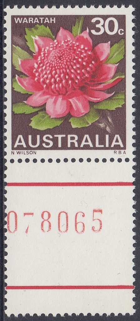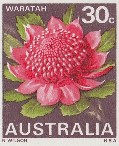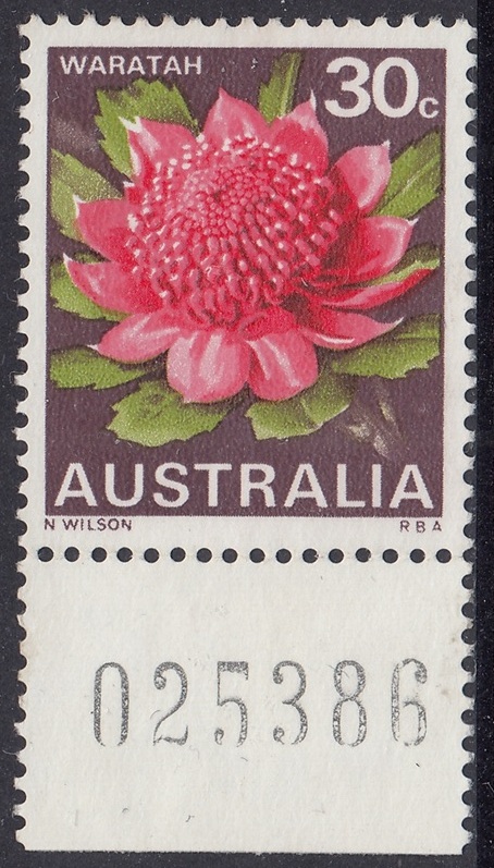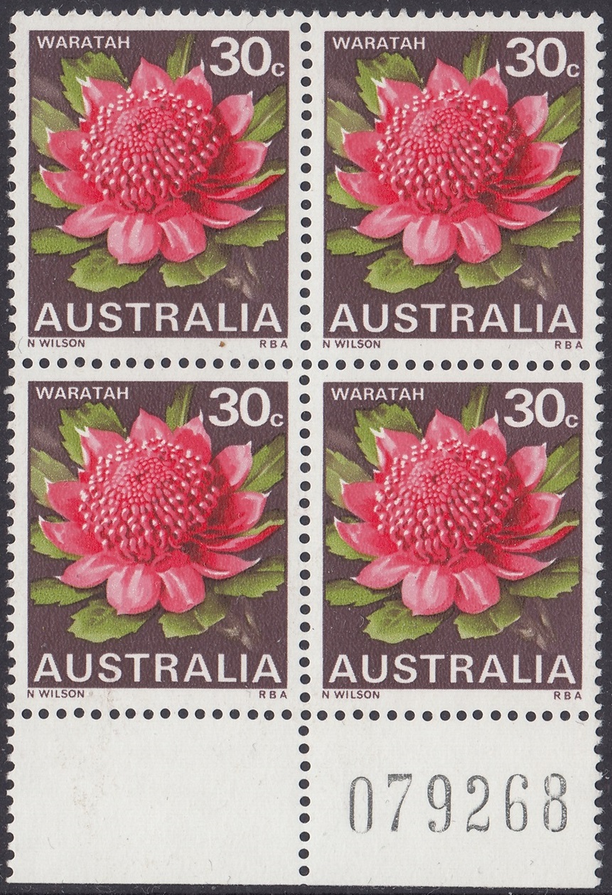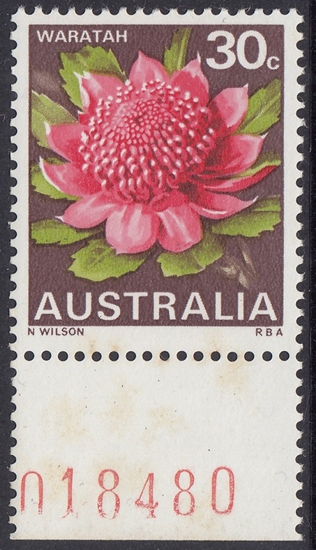 Stocks of the 30c Waratah stamp became in short supply at post offices in mid-1971. New printing cylinders had to be made because the original set was unservicable, and the resultant printing shows some colour variations from the earlier stamps. In the new printing greater areas of white are shown in the pink tones of the petals.