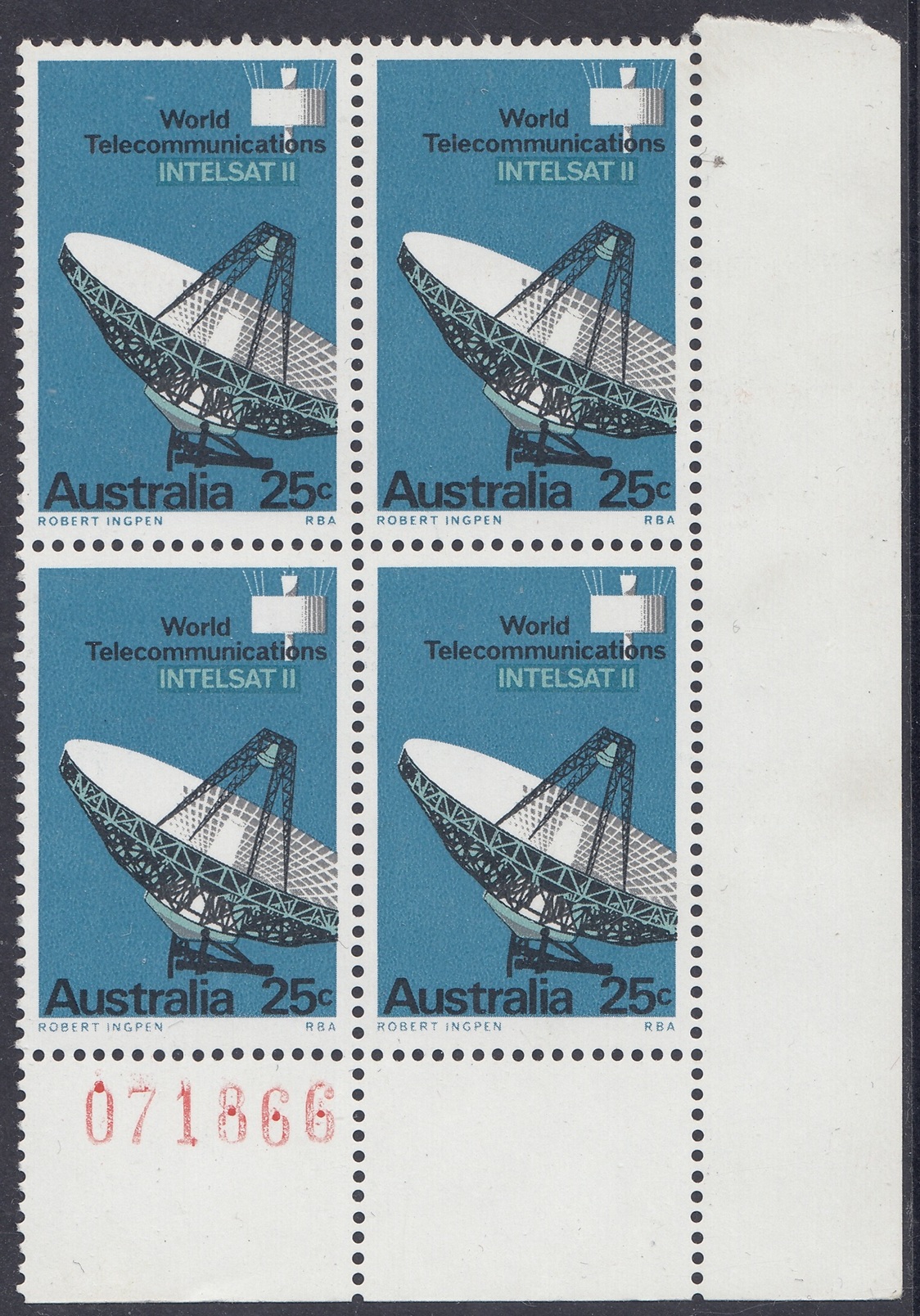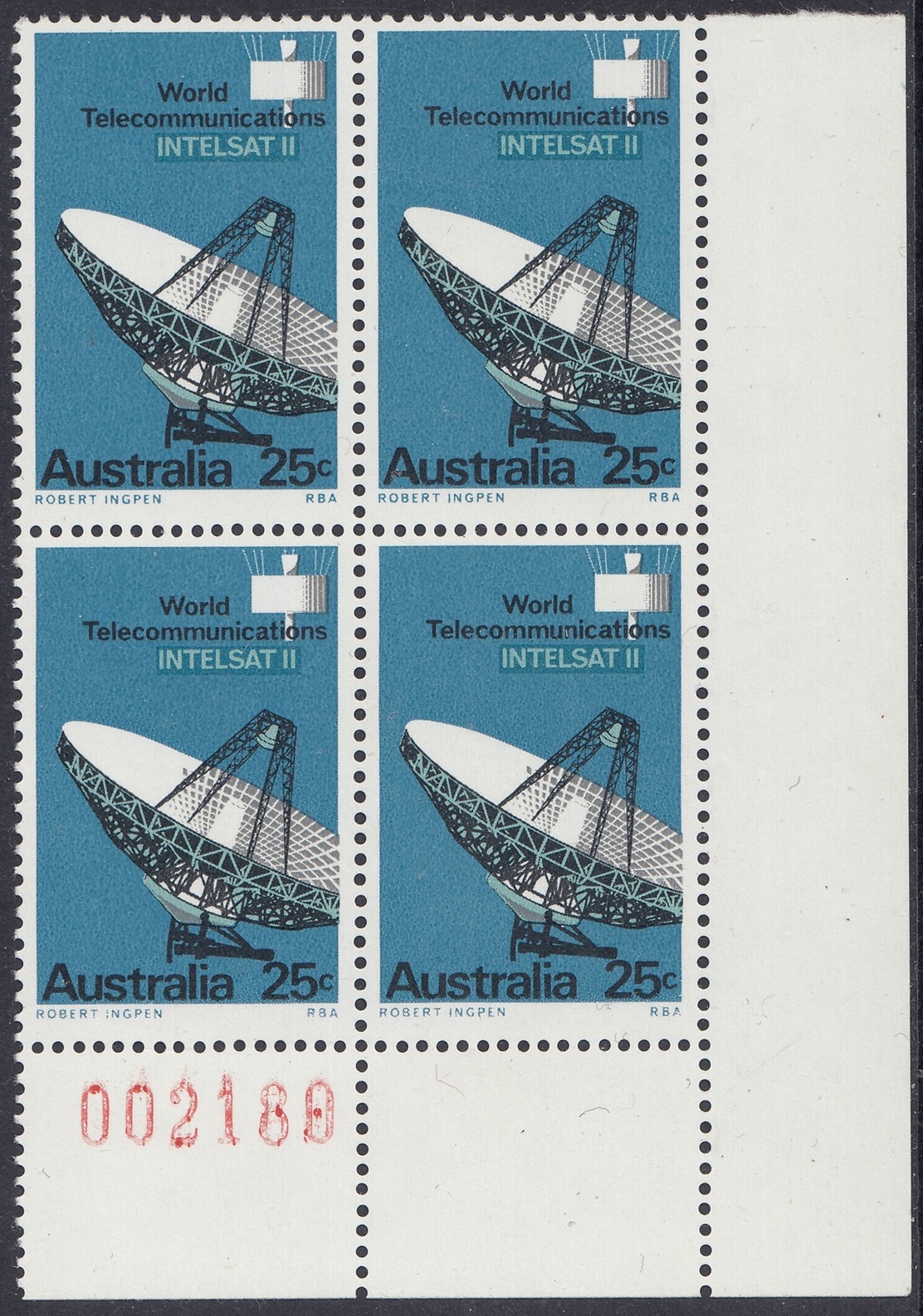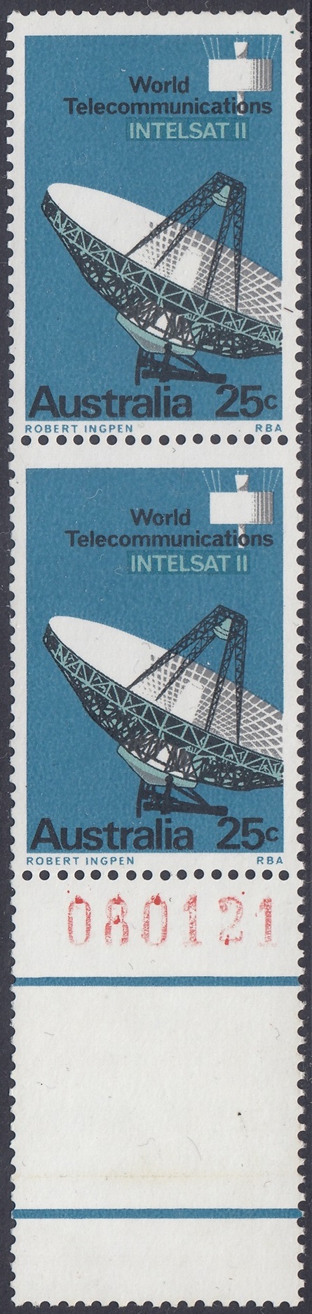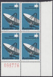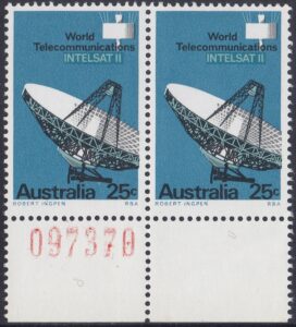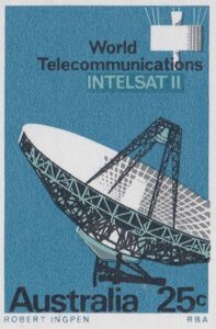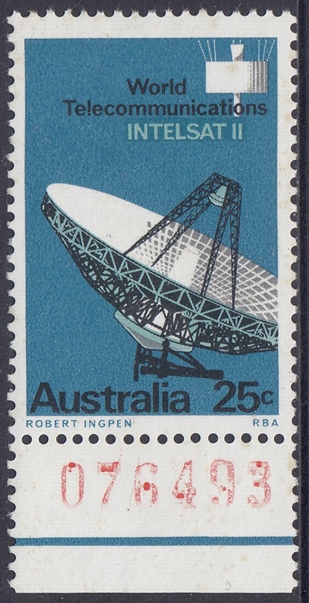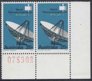 The 25c photo shows a marked panel behind the “INTELSAT II”, where the blue-green has been drawn in a wide area overprinted by blue in which the lettering has been reversed; this device, not so apparent in the actual stamp, was also adopted to avoid register faults which would have occured in the blue-green lettering had not been tailored closely to fit the reversal in blue.