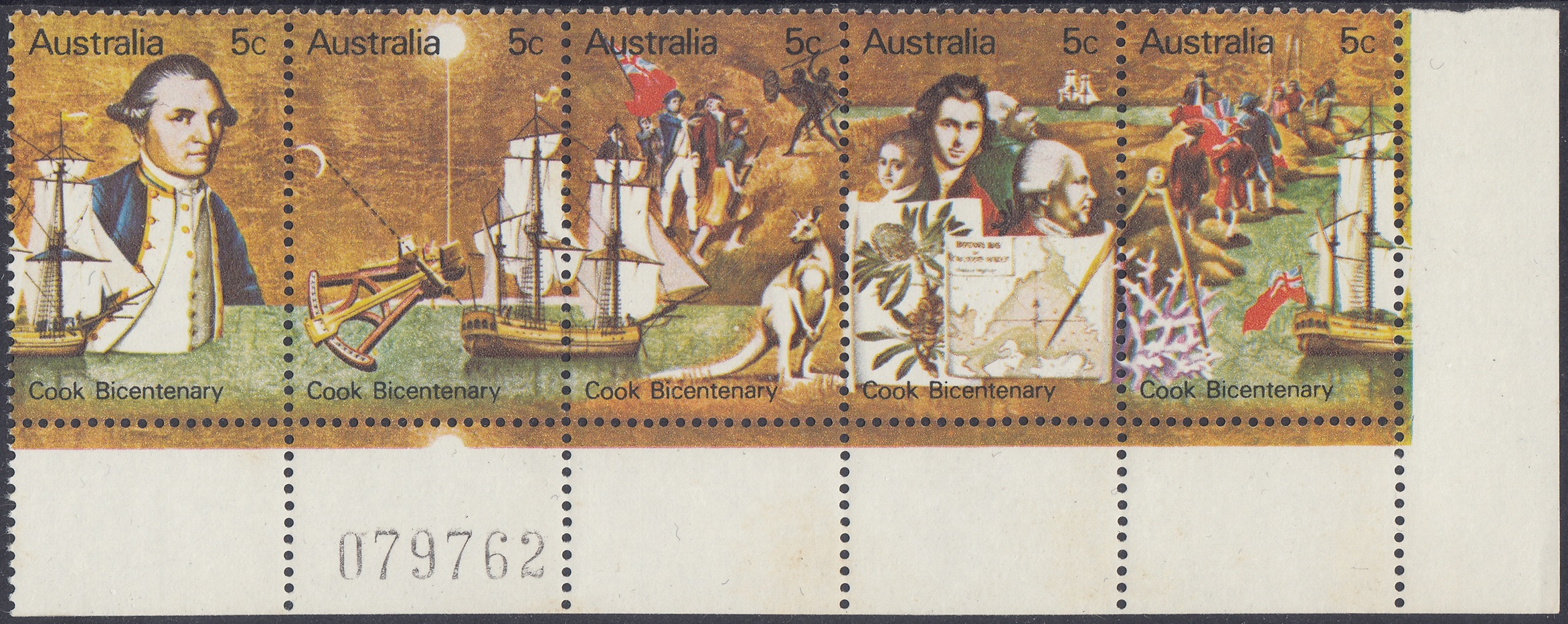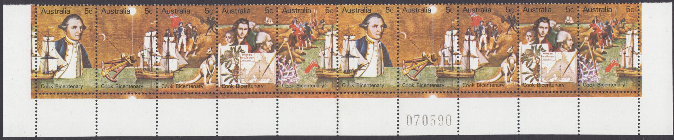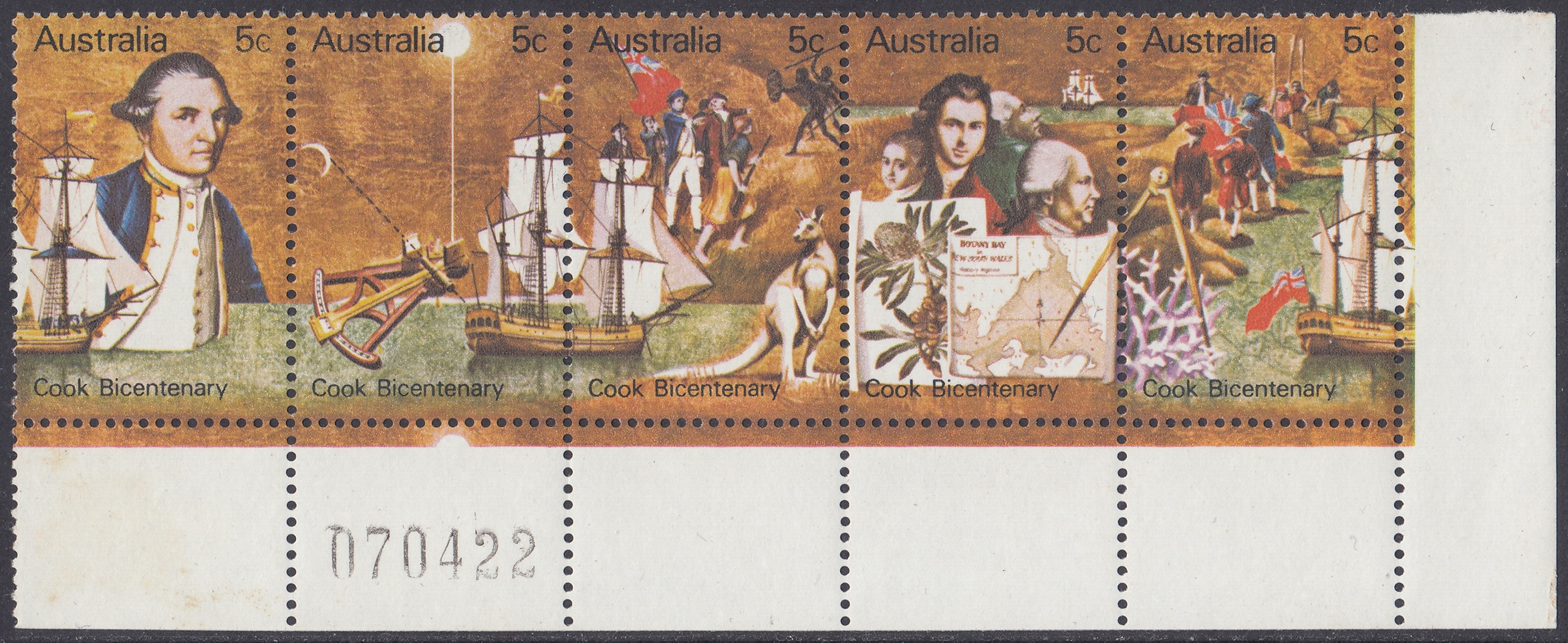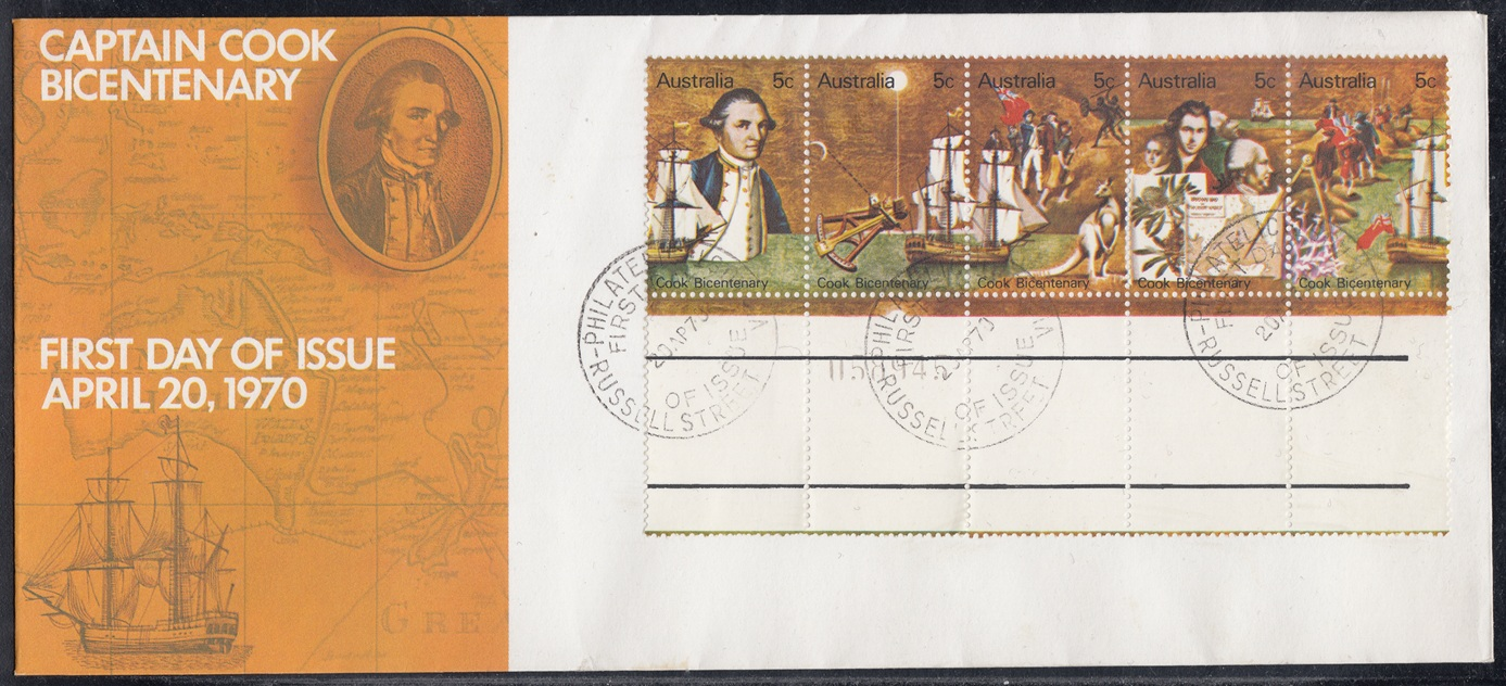 Australia Philately: 1970 Cook Bicentenary – 5c Strip of Five