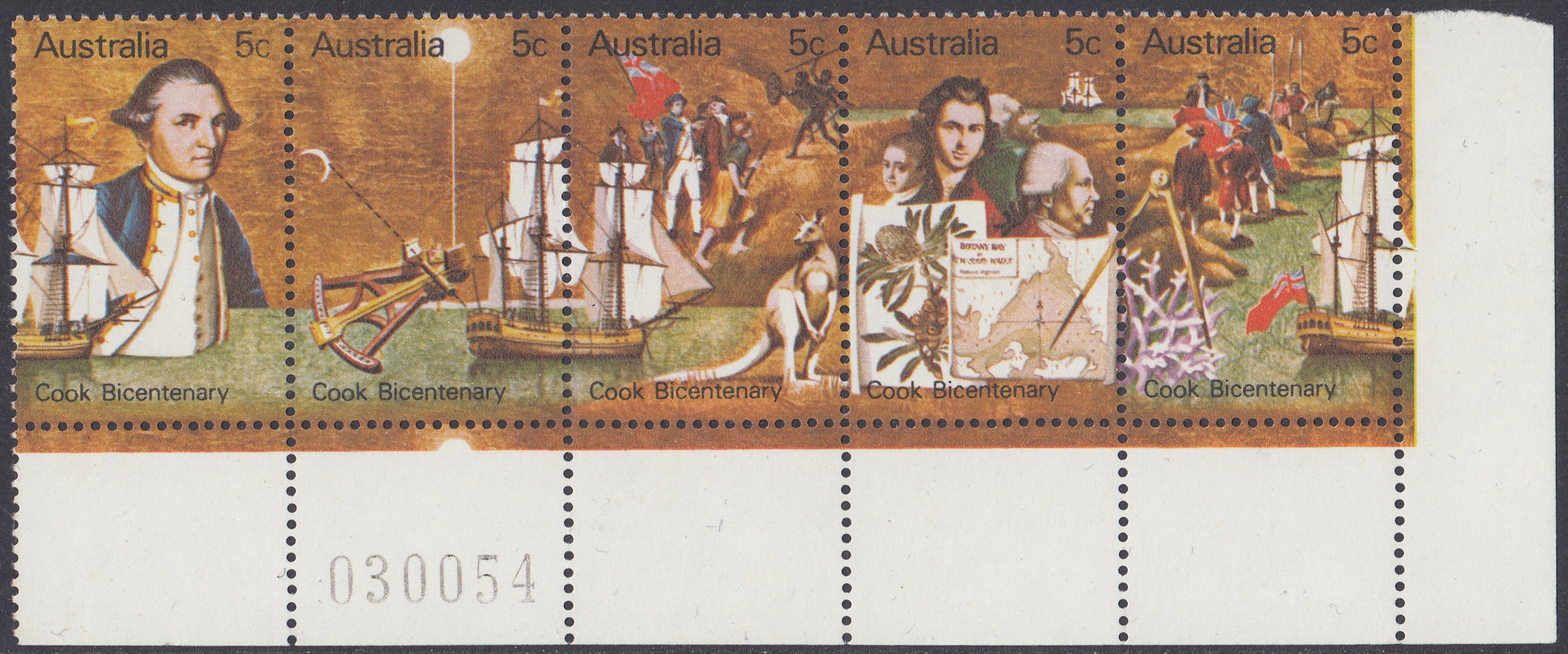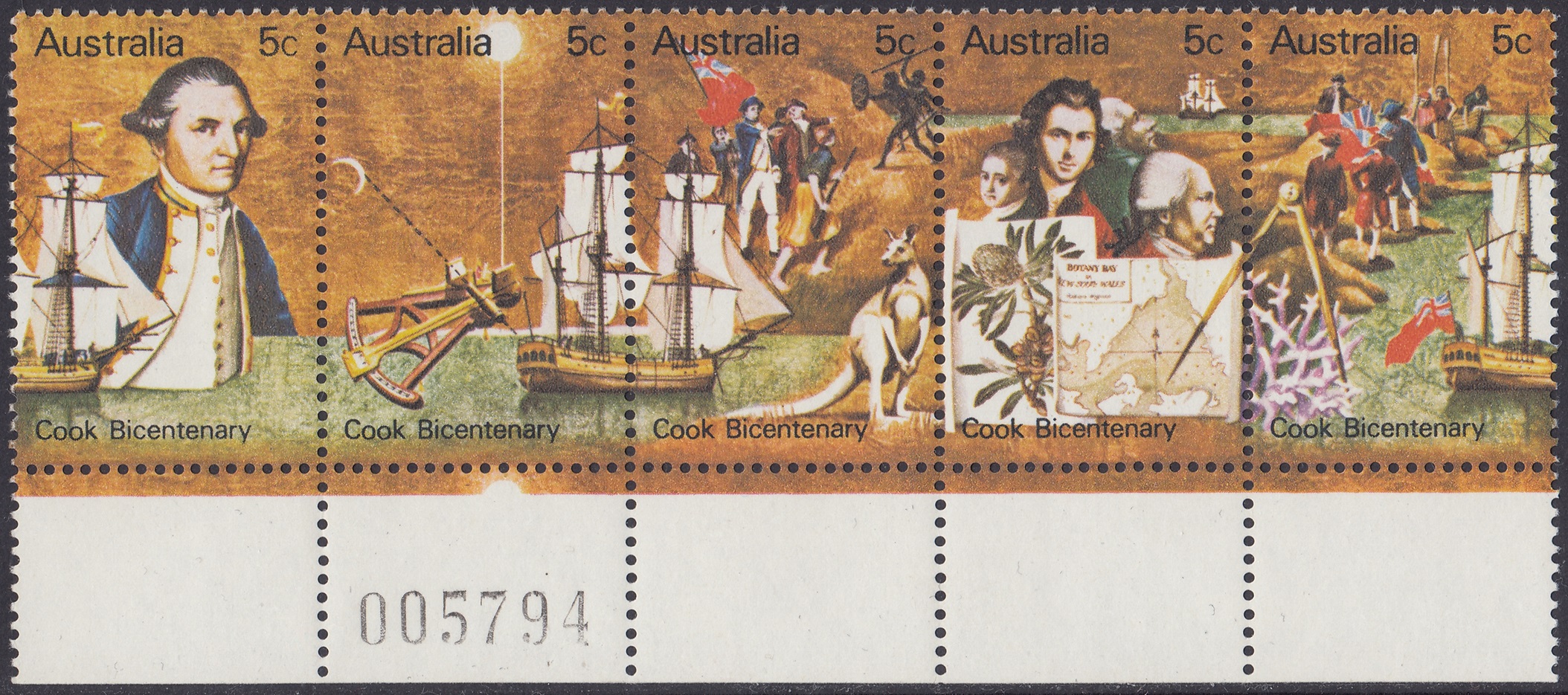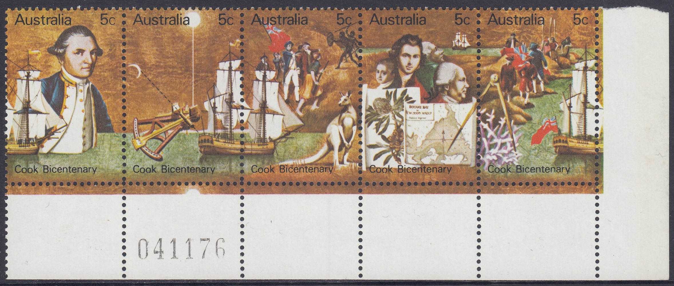 Australia Philately: 1970 Cook Bicentenary – 5c Strip of Five