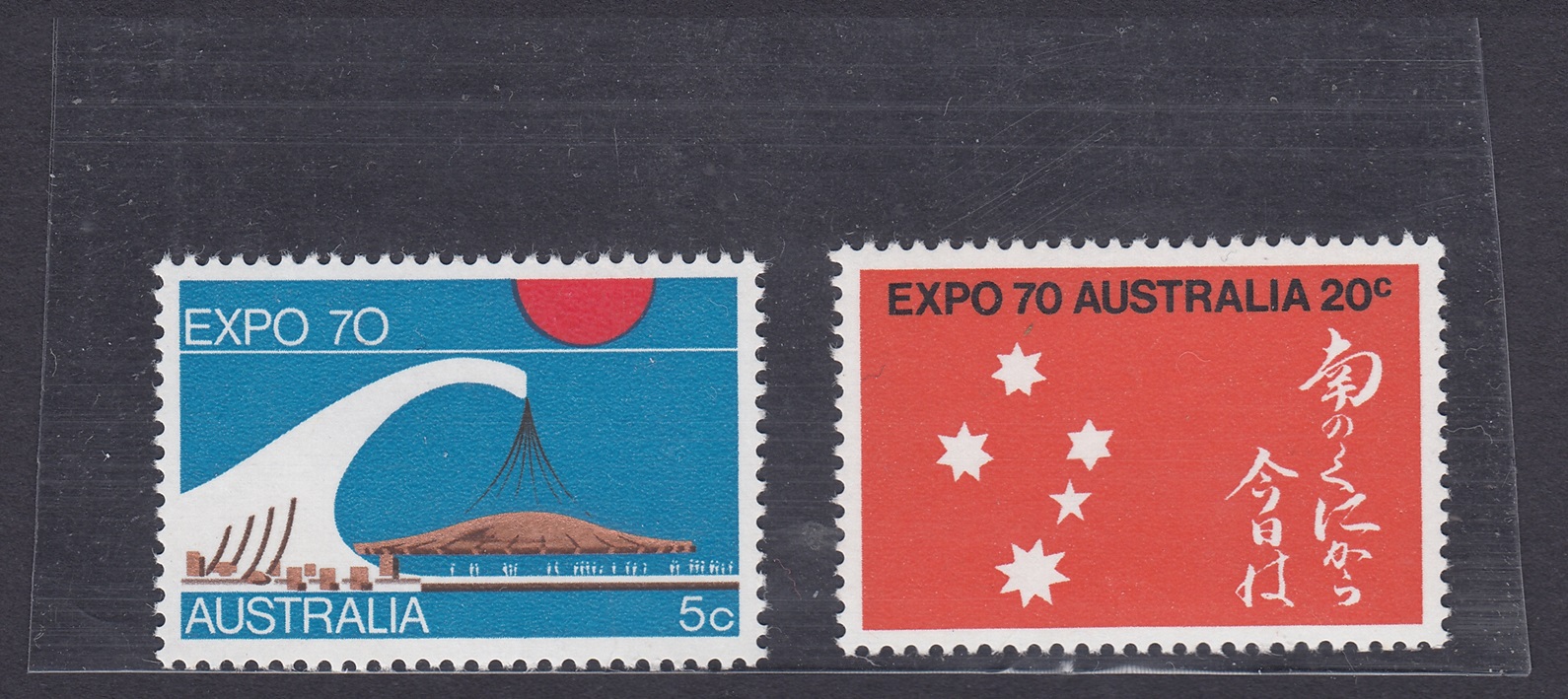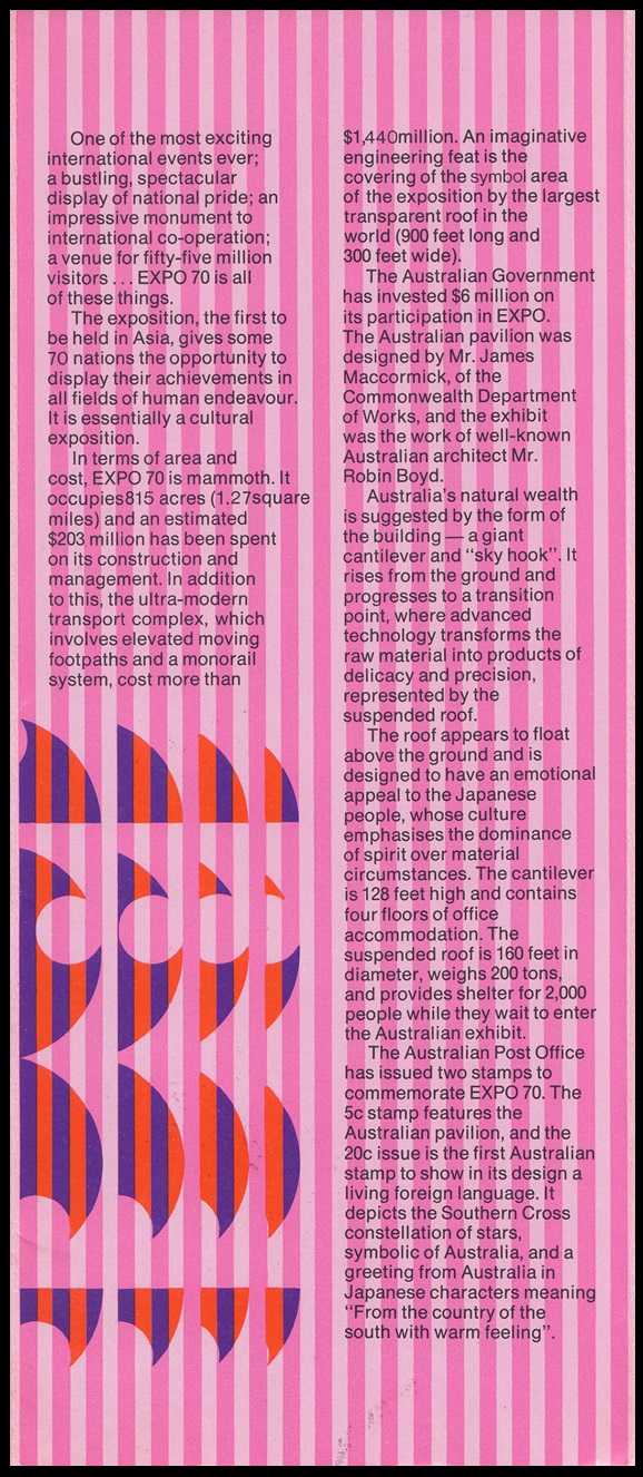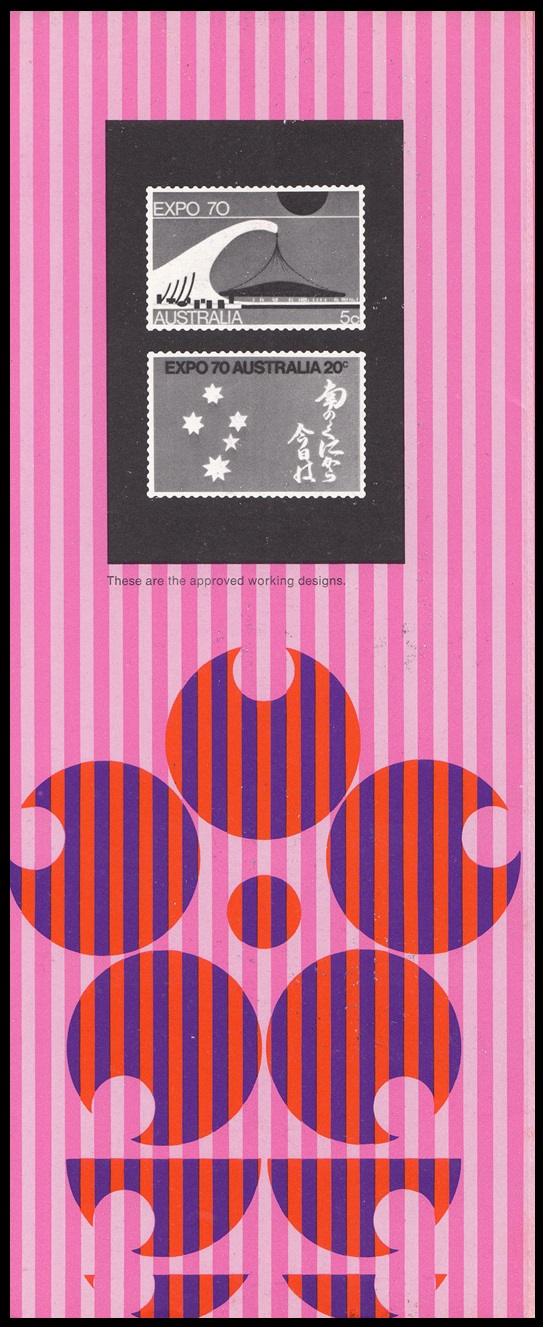 On 16th March, 1970, 5c and 20c stamps will be issued to mark Australia’s participation in Expo 70, the international exposition being held in Osaka, Japan, from March to September, 1970. The 5c stamp will be on sale at all post offices for about two weeks, and the 20c for some months.