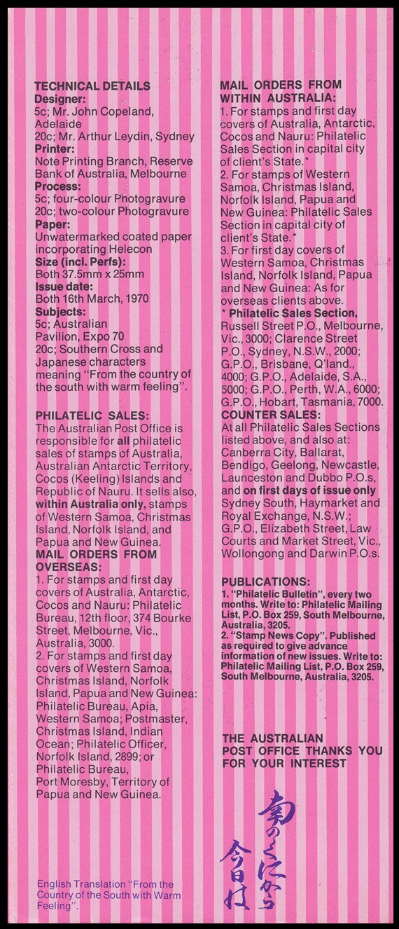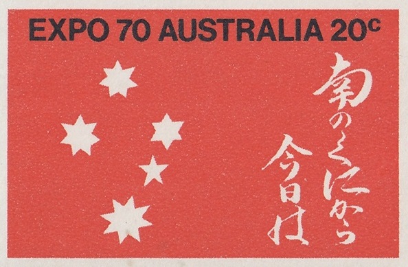 The 5c design was the work of Mr. John Copeland, of Adelaide, and shows the Australian pavillion at at EXPO 70. The background is blue, the “sun” is red, and brown and bronze are used to dilenate the pavillion. The 20c design, by Mr. Arhtur Leydin of Sydney, shows the Southern Cross and Japanese brush characters meaning “from the country of the south with warm feeling.” The background is red-orange, and the lettering at the top is black. Both stamps are of the usual large commemorative size, 34.5 mm x 22 mm, printed area, and were printed by photogravure by the Note Printing Branch, Reserve Bank of Australia, Melbourne, in sheets of 100 on paper incorporating helecon.