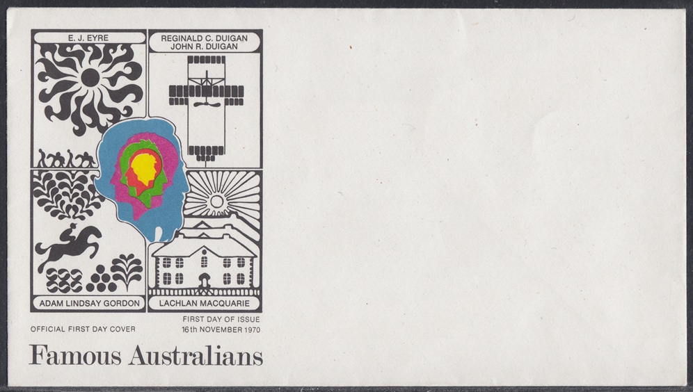 The second stamp booklet in the Famous Australians series was issued on 16th November, 1970, and will remain on sale for approximately 12 months. The stamp subjects are the Duigan brothers, pioneer aviators; explorer Edward John Eyre; poet Adam Lindsay Gordon; and Governor Lachlan Macquarie. Following the format established with the first Famous Australians booklet and the Prime Ministers booklet, each subject is shown in a separate pane containing five 6c stamps and a “little tab”. Each booklet, containing twenty 6c stamps, is priced at $1.20.