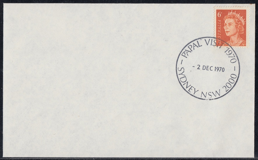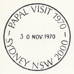 A special postmarker was used at a temporary post office in the Queen Victoria Building, York Street, Sydney, from 30th November to 3rd December, 1970, during the visit to Australia of His Holiness Pope Paul VI.