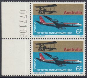 The stamps were designed by Mr. George Hamori of Sydney. His designs contrast a Qanata Boeing 707 with the first aircraft used by the company – a Sunbeam Dyak powered Avro 504.