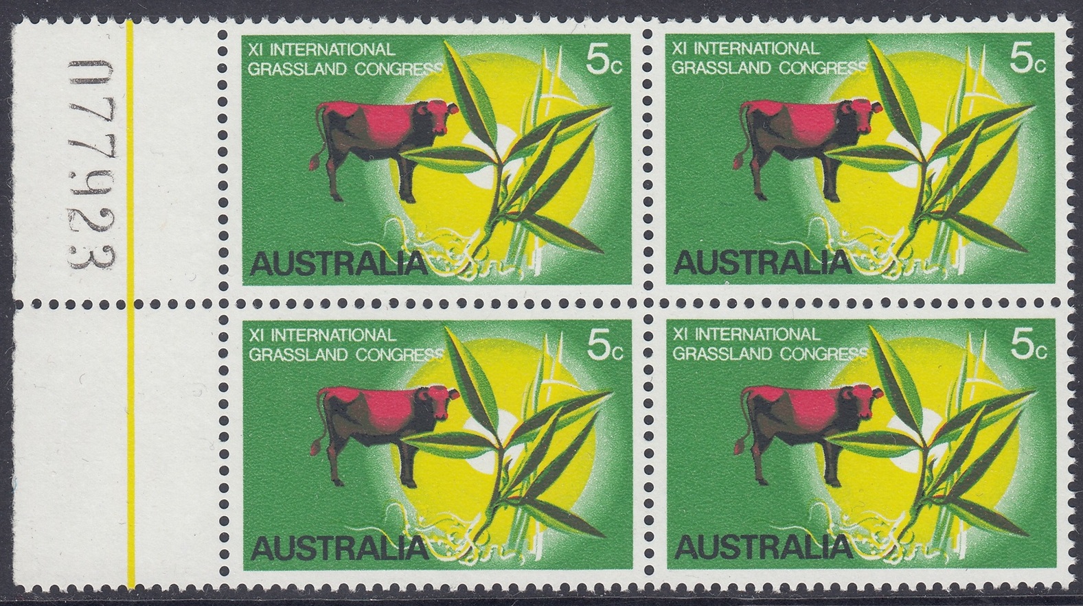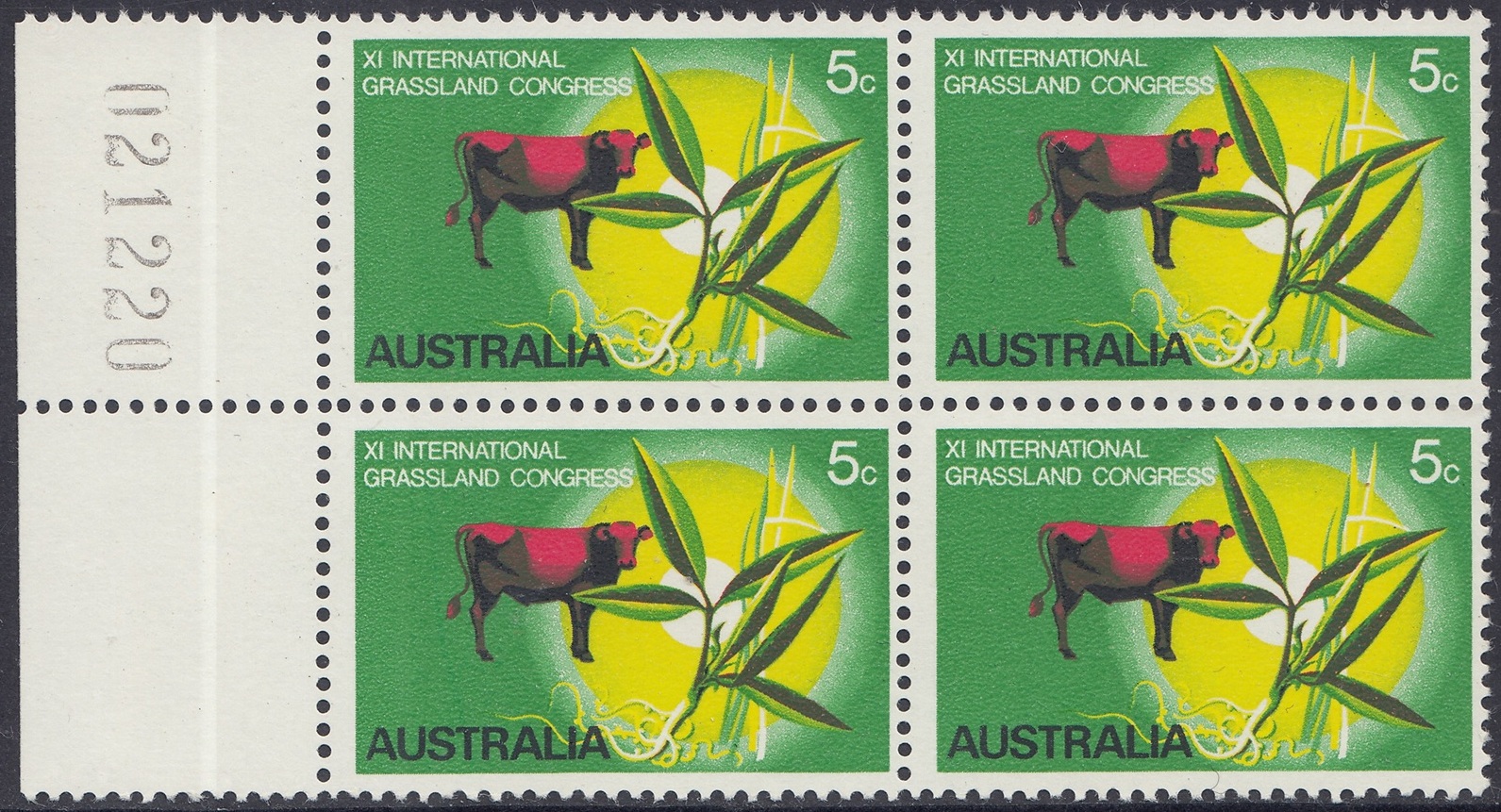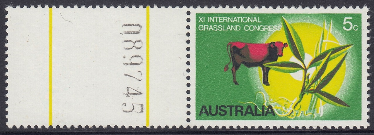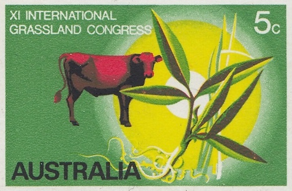 The stamp was designed by Mr. Robert Ingpen, of Melbourne, and has at its central motif the lucerne plant Townsville Stylo (Stylosanthes humilus) which has been developed by Australian scientists of the Commonwealth Scientific and Industrial Research Organisation esepcially for tropical regions, where natural grasses are often deficient in nutritional elements. Cattle in northern Australia are usually fed a combination of Townsville stylo and other grasses, for best results, and the design therefore shows a native speargrass, and a bull to emphasise the importance of tropical pastures to the cattle industry. The green background and the graduated yellow circle suggest tropical growth and the sun; the animal is in red.