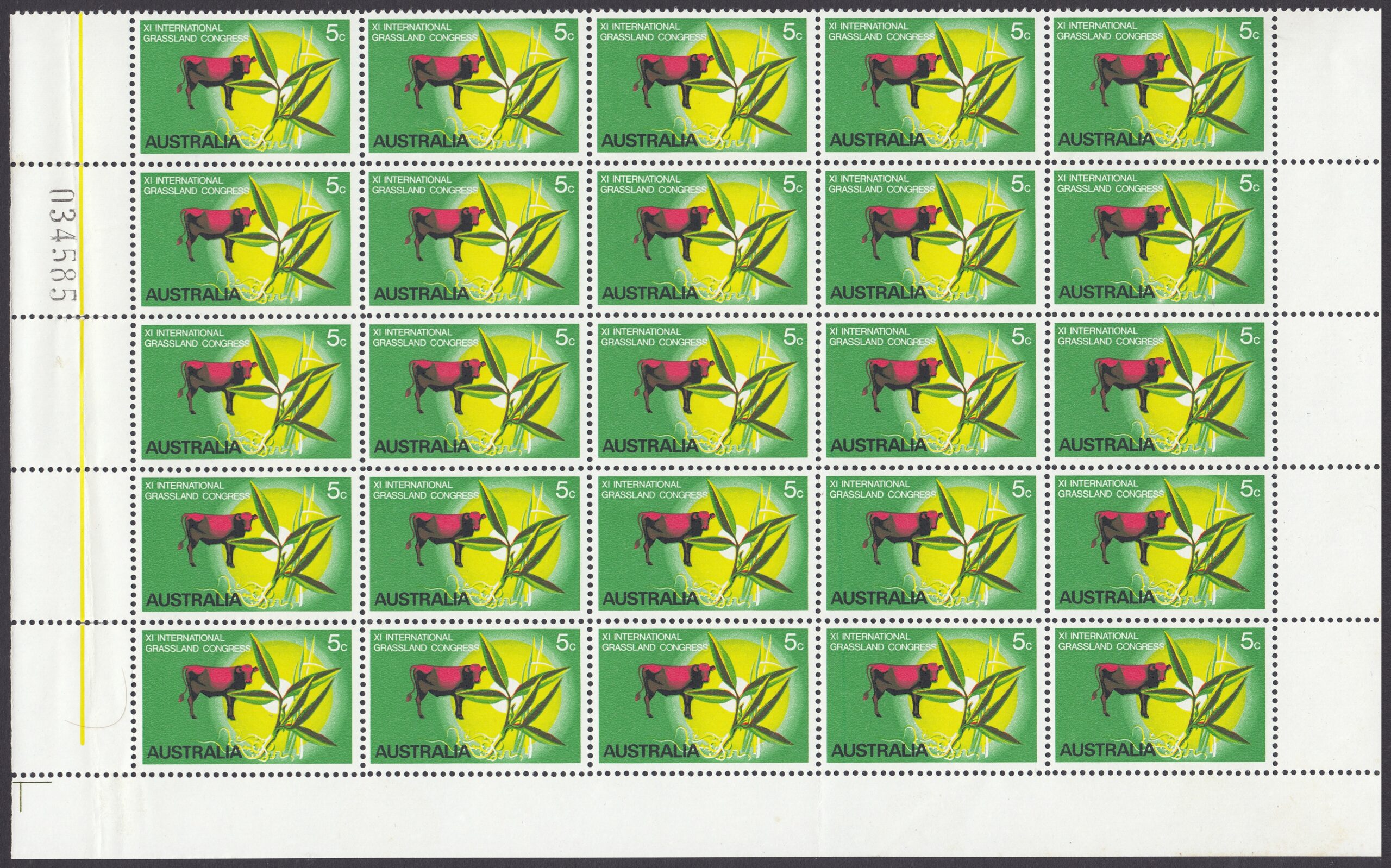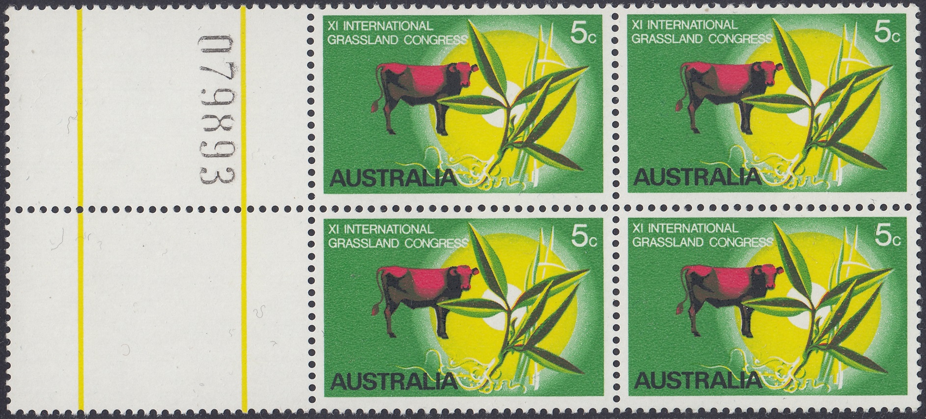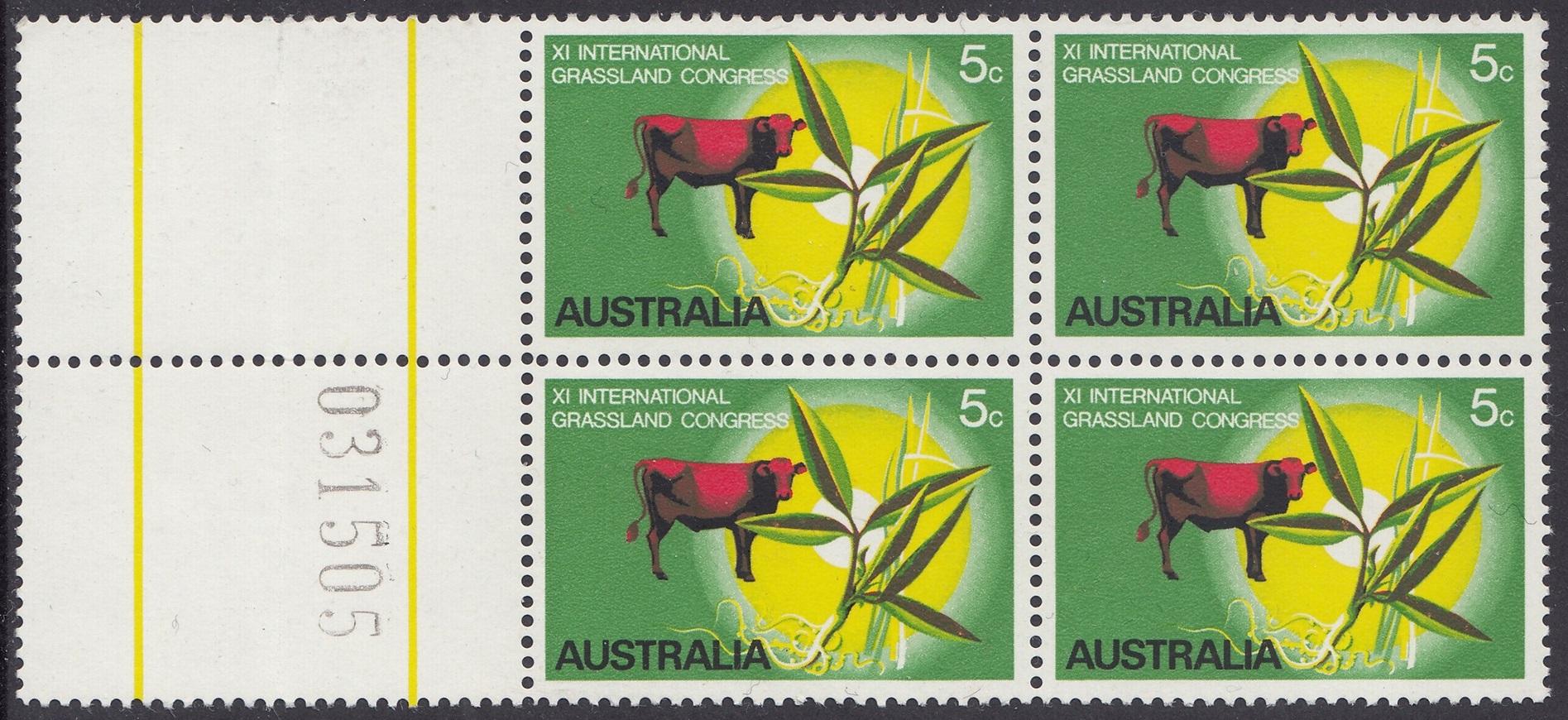 The stamp was designed by Mr. Robert Ingpen, of Melbourne, and has at its central motif the lucerne plant Townsville Stylo (Stylosanthes humilus) which has been developed by Australian scientists of the Commonwealth Scientific and Industrial Research Organisation esepcially for tropical regions, where natural grasses are often deficient in nutritional elements. Cattle in northern Australia are usually fed a combination of Townsville stylo and other grasses, for best results, and the design therefore shows a native speargrass, and a bull to emphasise the importance of tropical pastures to the cattle industry. The green background and the graduated yellow circle suggest tropical growth and the sun; the animal is in red.