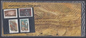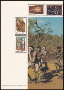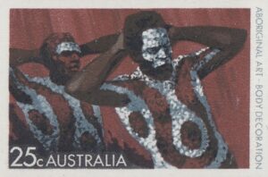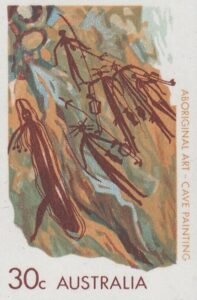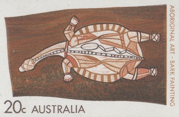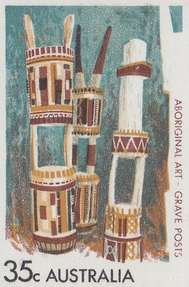 A series of four definitive stamps featuring aboriginal art subjects was issued on 29th September, 1971. The values and subjects are 20c Bark Painting, 25c Body Decoration, 30c Cave Painting, 35c Grave Posts.