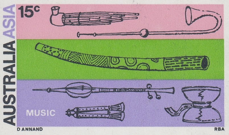 In each stamp design, Mr. Annand has used an Australian motif centrally, surrounded by Asian motifs.