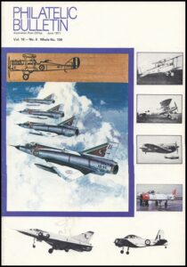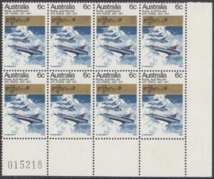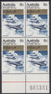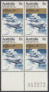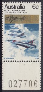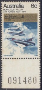 A 6c stamp commemorating the 50th anniversary of the Royal Australian Air Force was issued on 9th June, 1971. It was designed by Mr. Ray Honisett, of Melbourne, a well-known aircraft illustrator, whose work includes commissions for the Australian War Memorial, Canberra. Mr. Honisett also designed the two first day covers issued by the Australian Post Office in conjunction with the RAAF stamp. Of the usual commemorative size of 25mm x 37.5mm, including perforations, the stamp was printed in sheets of 100 on coated paper incorporating helecon, on the Chambon photogravure press of the Note Printing Branch, Reserve Bank of Australia, Melbourne. The design shows a De Havilland DH9a, one of the RAAF’s 1921 machines, and a flight of Australian-built Mirage jet fighters of No.76 Squadron.