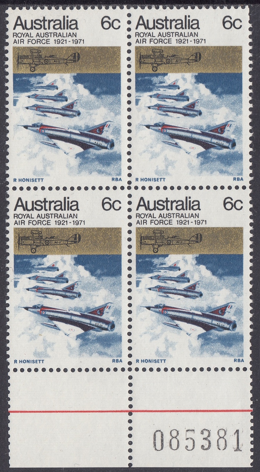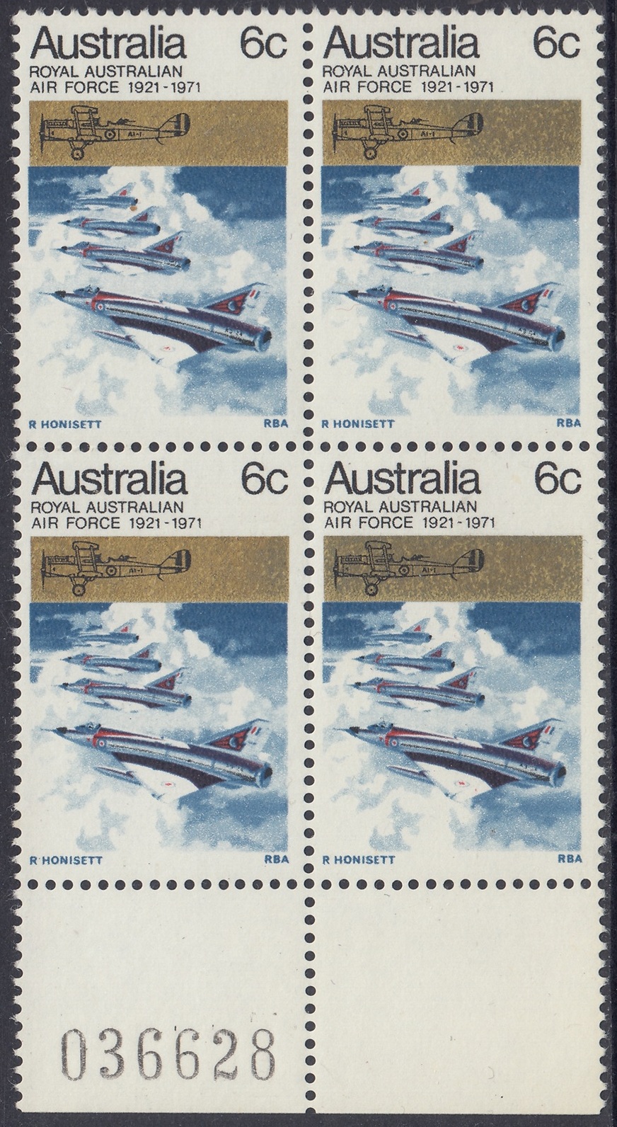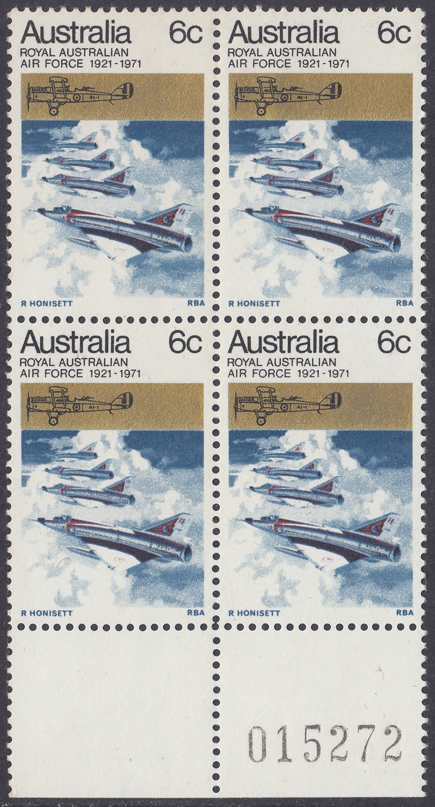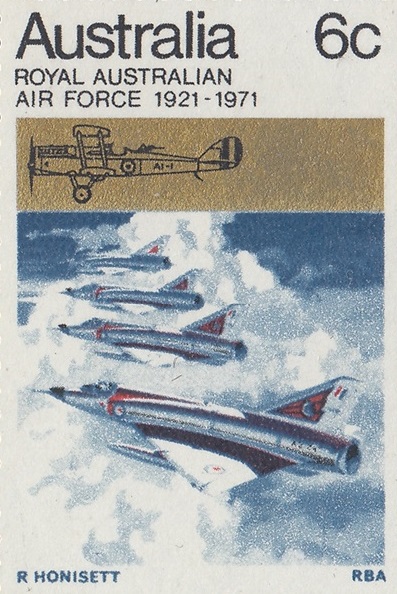 A 6c stamp commemorating the 50th anniversary of the Royal Australian Air Force was issued on 9th June, 1971. It was designed by Mr. Ray Honisett, of Melbourne, a well-known aircraft illustrator, whose work includes commissions for the Australian War Memorial, Canberra. Mr. Honisett also designed the two first day covers issued by the Australian Post Office in conjunction with the RAAF stamp. Of the usual commemorative size of 25mm x 37.5mm, including perforations, the stamp was printed in sheets of 100 on coated paper incorporating helecon, on the Chambon photogravure press of the Note Printing Branch, Reserve Bank of Australia, Melbourne. The design shows a De Havilland DH9a, one of the RAAF’s 1921 machines, and a flight of Australian-built Mirage jet fighters of No.76 Squadron.