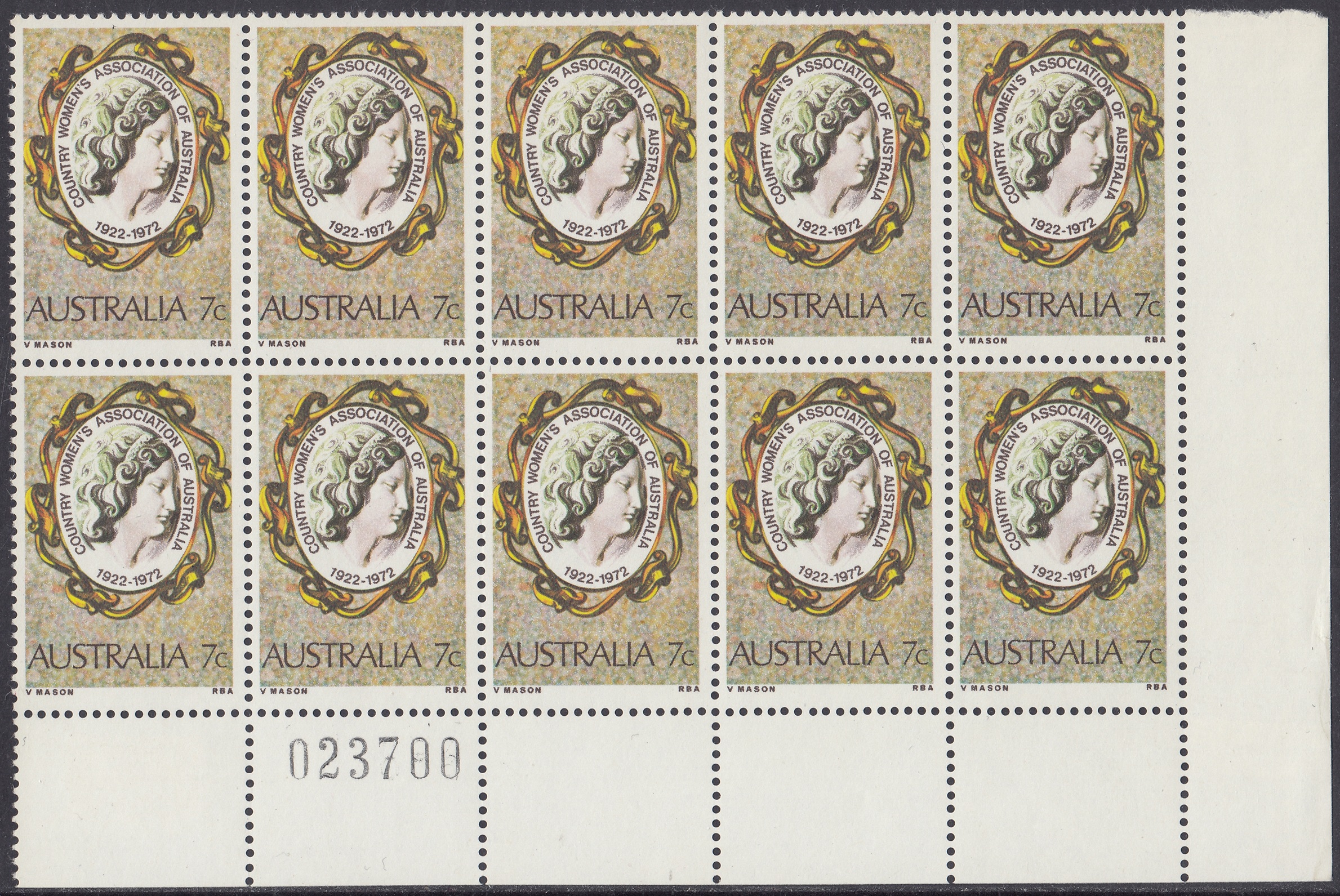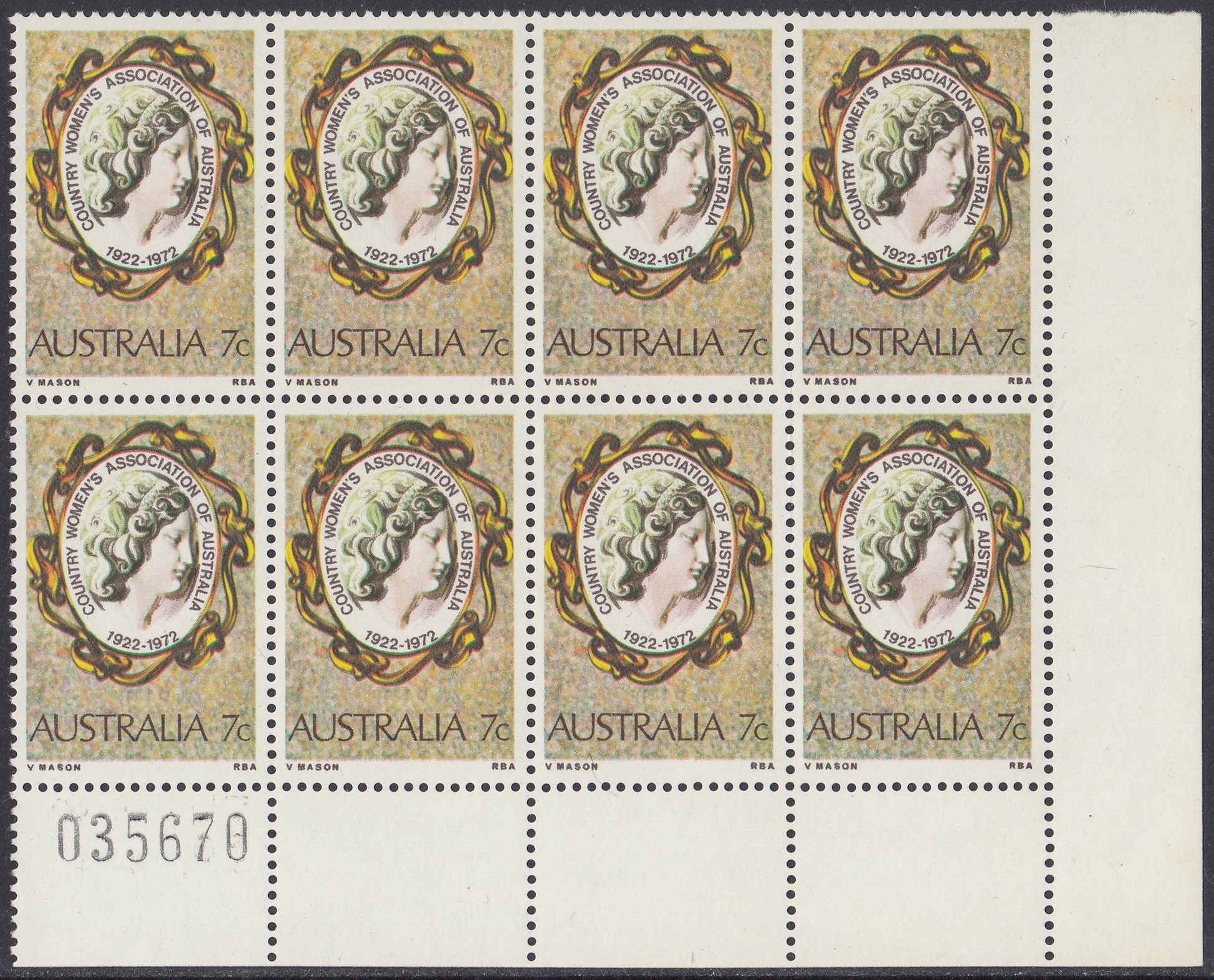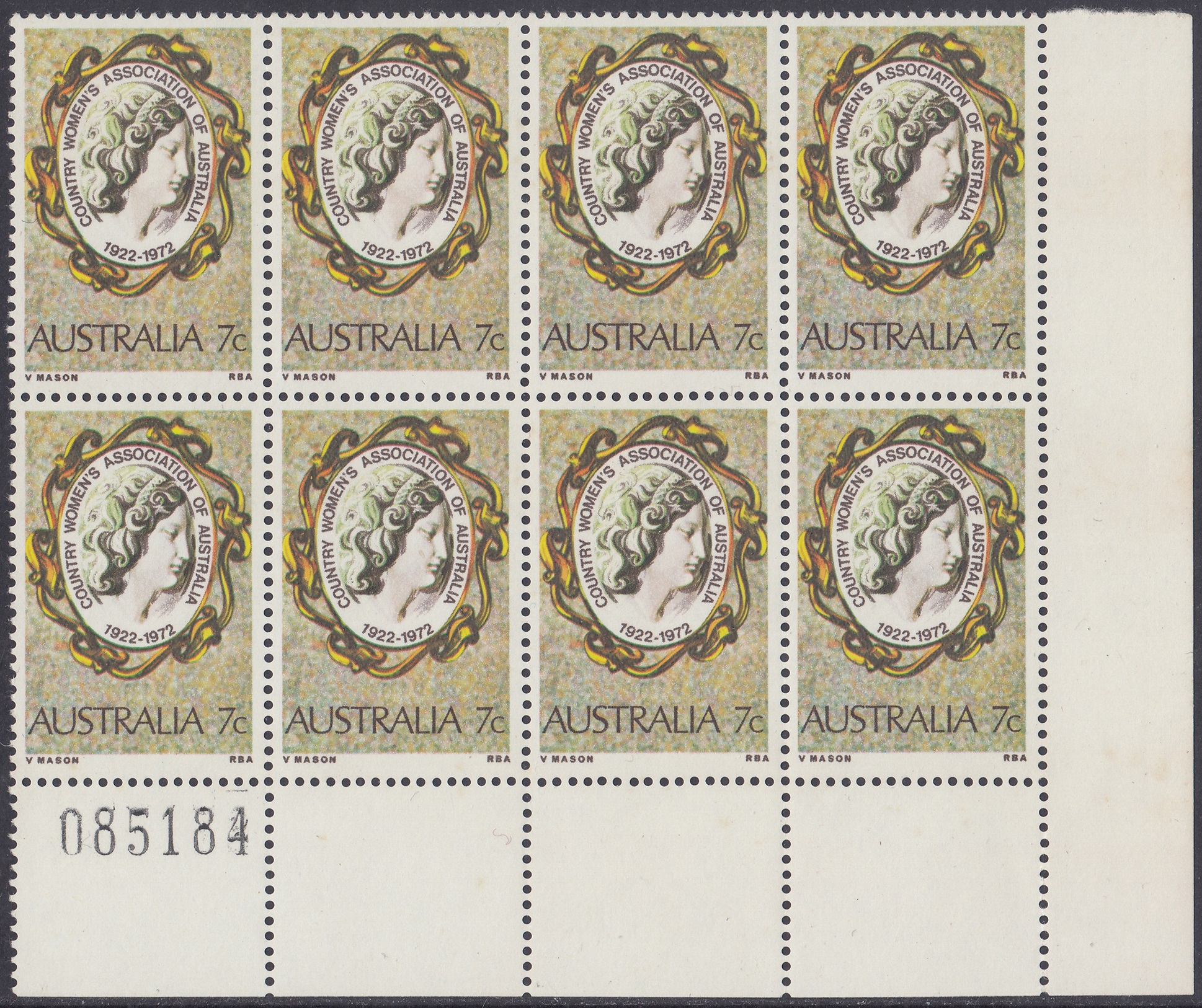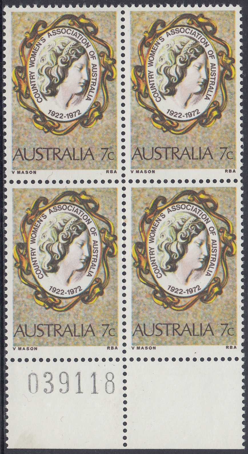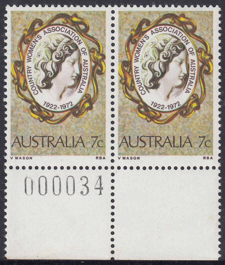 The C.W.A. stamp design shows a woman’s head on a gold-framed cameo brooch, symbolizing the femininity of a moverment concerned with the welfare of women and children of rural communities. The stamp is in the usual commemorative size, 25 mm x 37.5 mm (including perfs.) and was printed in sheets of 100, by multicolour photogravure, at the Note Printing Branch, Reserve Bank of Australia, Melbourne. The paper was Wiggins Teape unwatered coated paper, incorporating helecon; four cylinders were used in the printing, and the colours (in order of application) were yellow, magenta, cyan and sepia.