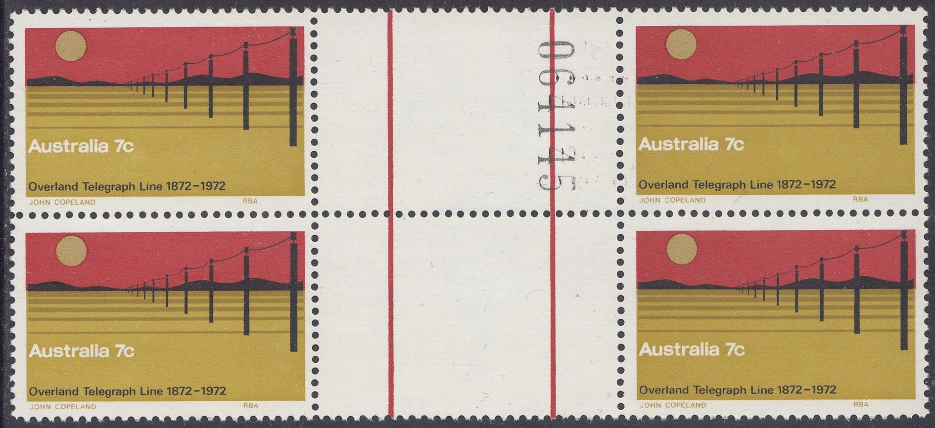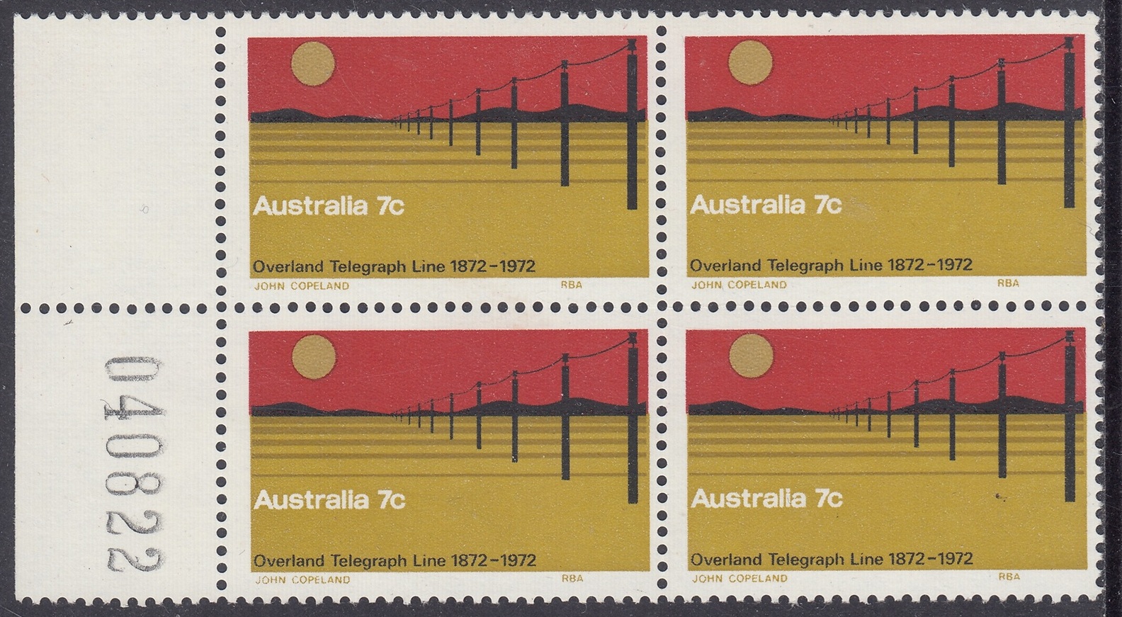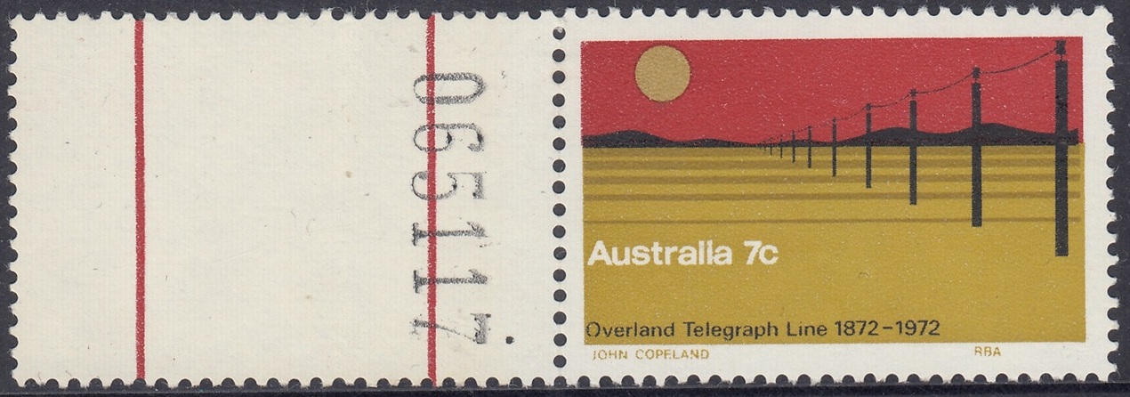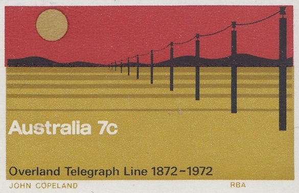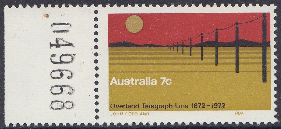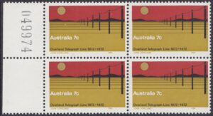 The 7c stamp marking the centenary of the completion of the Overland Telegraph line was issued on 22nd August, 1972, for two weeks sale at post offices and six months sale at the philatelic sales centres. It was designed by Mr. John Copeland, of Adelaide, and the design shows the telegraph line crossing a lonely stretch of Central Australian landscape. The colours, in order of printing, are light ochre, dark ochre, red and black. Four cylinders – one for each colour – were used, and the stamp was printed by photogravure on Wiggins Teape coated unwatermarked paper incorporating helecon, by the Note Printing Branch, Reserve Bank of Australia, Melbourne. Stamp size is 37.5mm x 25mm, and sheet content is 100 stamps.