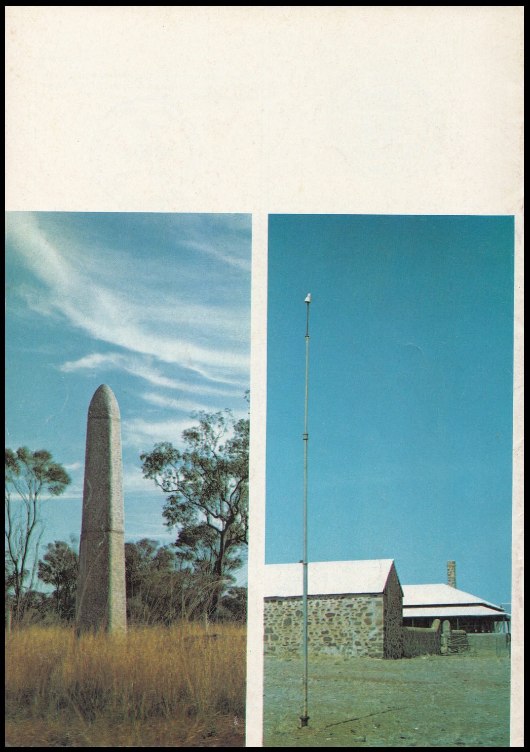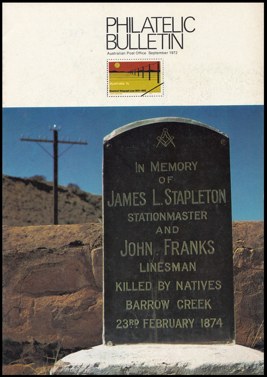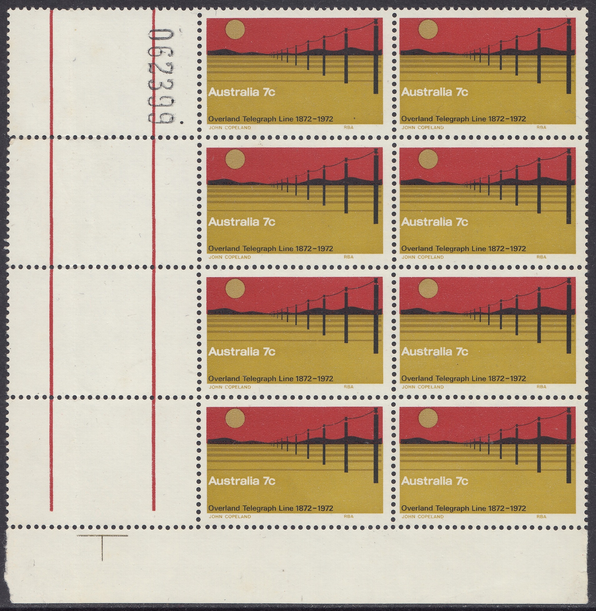 The 7c stamp marking the centenary of the completion of the Overland Telegraph line was issued on 22nd August, 1972, for two weeks sale at post offices and six months sale at the philatelic sales centres. It was designed by Mr. John Copeland, of Adelaide, and the design shows the telegraph line crossing a lonely stretch of Central Australian landscape. The colours, in order of printing, are light ochre, dark ochre, red and black. Four cylinders – one for each colour – were used, and the stamp was printed by photogravure on Wiggins Teape coated unwatermarked paper incorporating helecon, by the Note Printing Branch, Reserve Bank of Australia, Melbourne. Stamp size is 37.5mm x 25mm, and sheet content is 100 stamps.