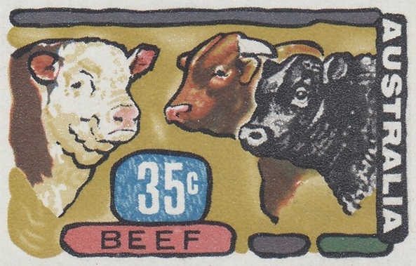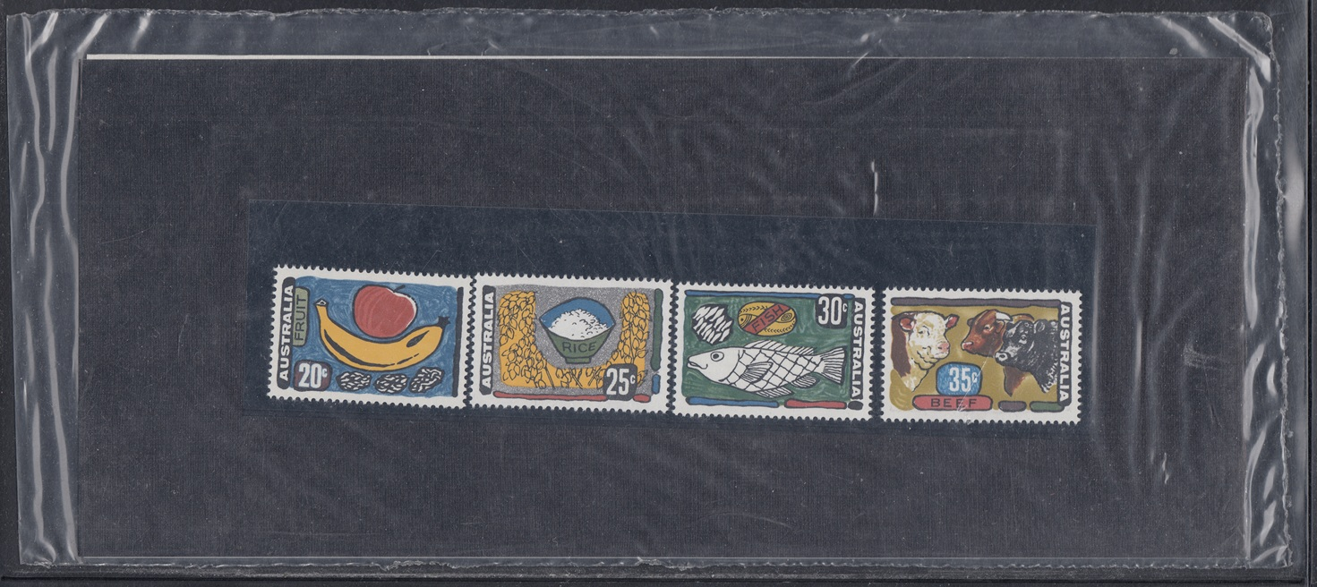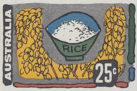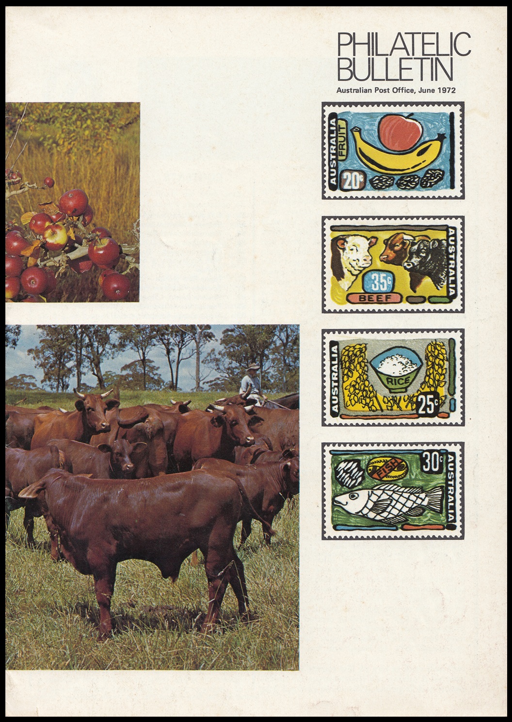 The fruit, rice, fish and beef industries are featured on 20c, 25c, 30c and 35c stamps issued on 14th June, 1972. They were designed by Mr. Douglas Annand of Sydney, who previously designed the Australia-Asia series.