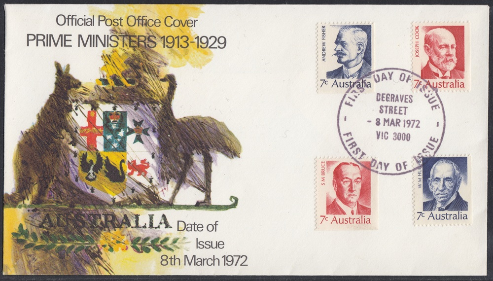 Australia Australia Philately: 1972 Prime Ministers (1913-1929) – First Day Cover No.33 (VIC) James Gavin 08/03/1972 3000 – DEGRAVES STREET 3000 – PHILATELIC BUREAU 3175 – DANDENONG 3199 – FRANKSTON