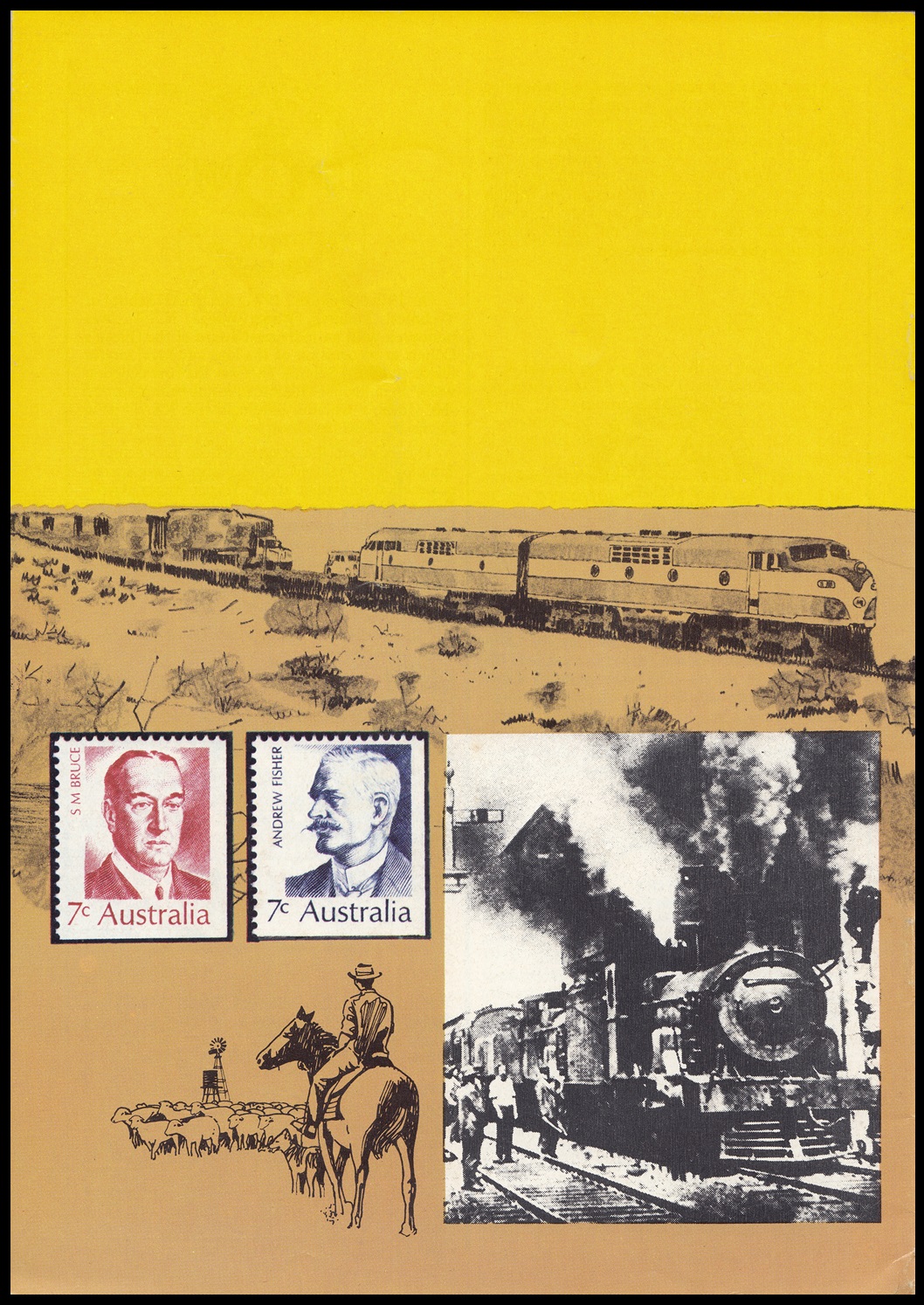 Four further stamps of the Prime Ministers series, in booklet form, were issued on 8th March, 1972; the subjects are Andrew Fisher, Joseph Cook, W. M. Hughes and S. M. Bruce. In the $1.40 booklet for post office counter sale there are twenty 7c stamps, in the same size and format as those of earlier booklets in this and the Famous Australians series. Each booklet is compromised of four panes each of five stamps plus a “little tab”. Each stamp measures 20.25 mm x 24.05 mm, and is partially imperforate.