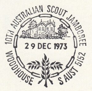 A temporary post office was provided for the 10th Australian Scout Jamboree held at “Woodhouse”, Stirling East, South Australia, during the period 29th December, 1973, to 6th January, 1974; 40,583 articles including 284 registered were postmarked with the special postmarker.