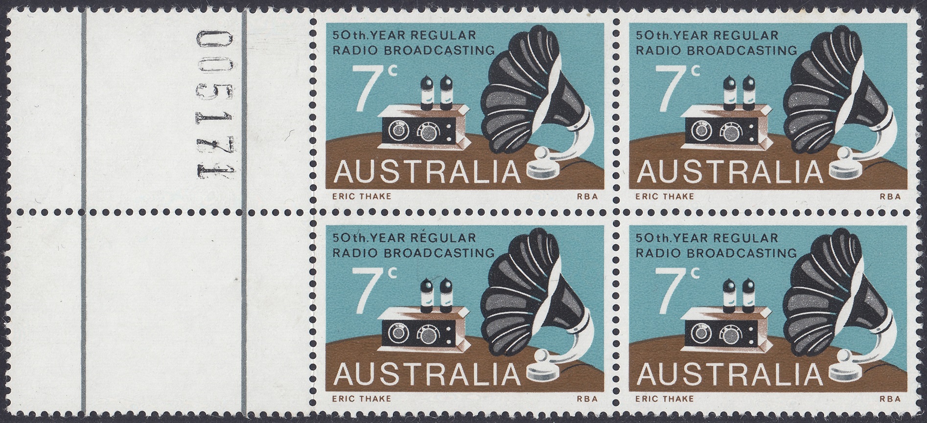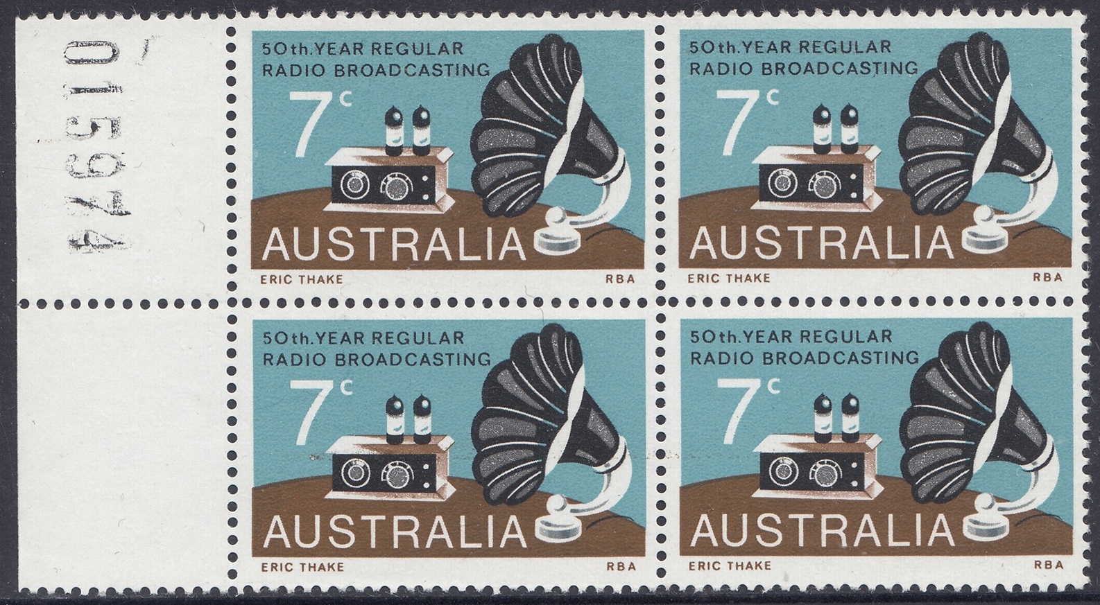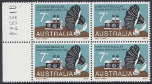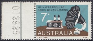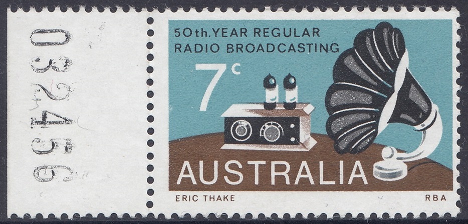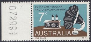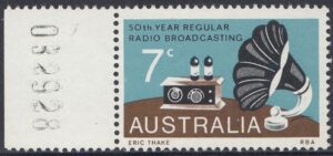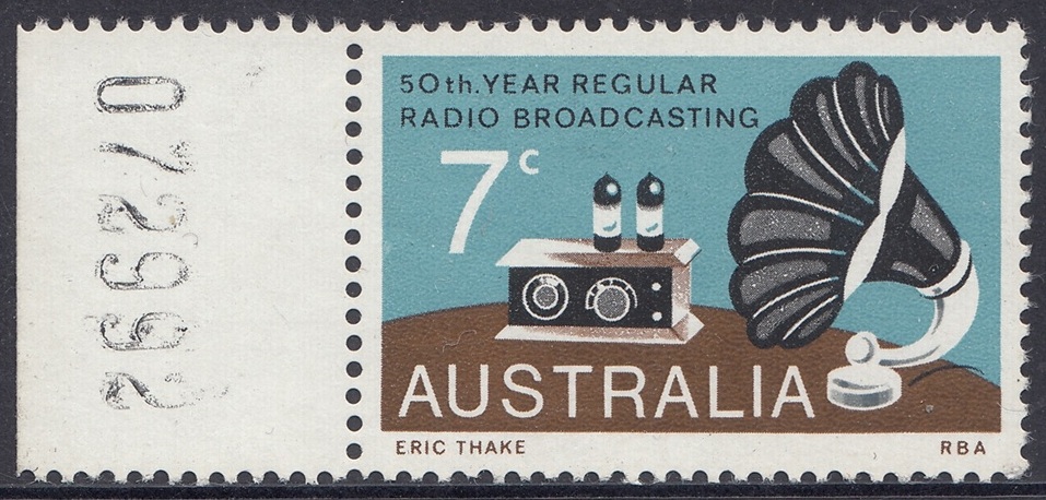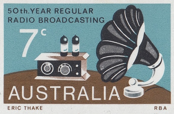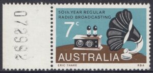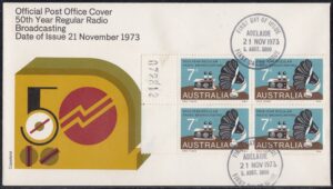 A 7c stamp to commemorate the 50th anniversary of regular radio broadcasting in Australia was issued on 21st November, 1973, for two weeks sales at post offices and for up to six months at philatelic sales centres.