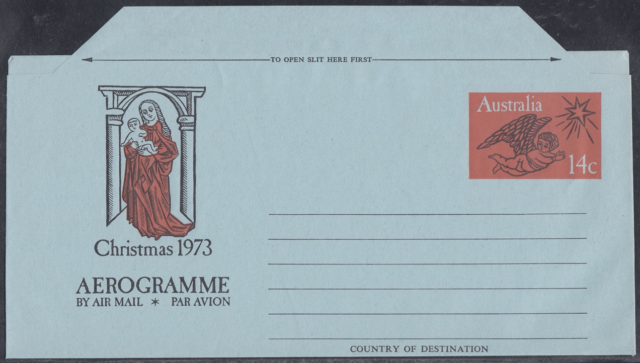 A Christmas aerogramme was also designed by Mr. Hamori in the woodcut style, and issued on 14th November, 1973. The aerogramme depicts Mary and the infant Jesus in an illustrated panel on the left-hand side of the address face and an angel in the stamp area.