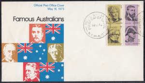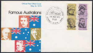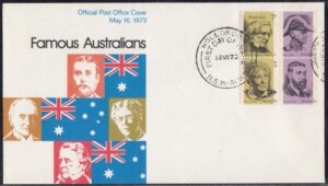 Australia Australia Philately: 1973 Famous Australians – First Day Cover No.48 (NSW) thedigitalphilatelist 16/05/1973 2000 – PHILATELIC SALES CENTRE SYDNEY 2000 – ROYAL EXCHANGE 2100 – BROOKVALE 2500 – WOLLONGONG