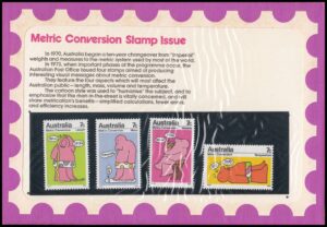 The series was designed by the Melbourne firm of Weatherhead and Sitt, Pty. Ltd., who also prepared the official first day cover. After considering a number of approaches to the subject, Bruce Weathehead and Alex Stitt adopted a cartoon style to emphasize forcefully and humourously how metric conversion affects people’s daily lives.