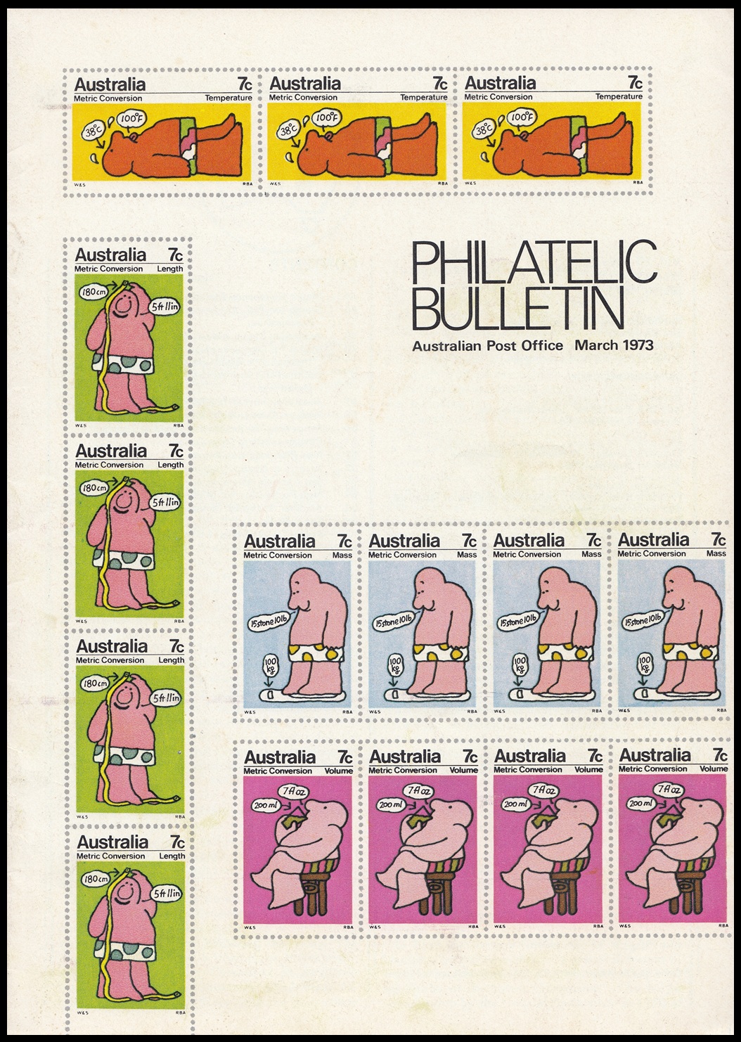 Four 7c stamps to commemorate Australia’s change to metric measurements were issued on 7th March, 1973.