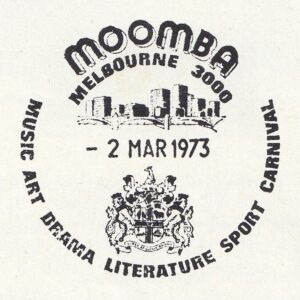 A special pictorial postmarker was used to cancel a total of 8,938 articles, including 38 registered, at a temporary post office at Melbourne, from 2nd to 12th March, 1973, during the 1973 Moomba Festival. A new design for the postmarker was adopted for this year’s festival and replaced the one which had been used in previous years.