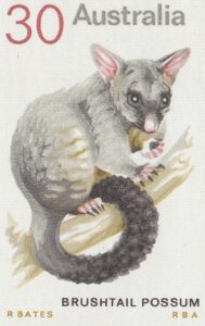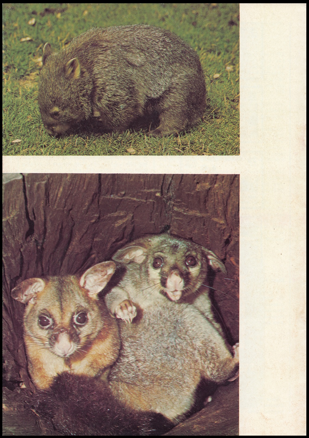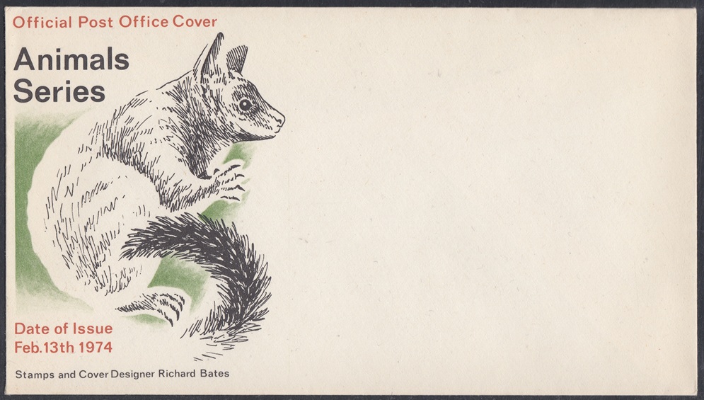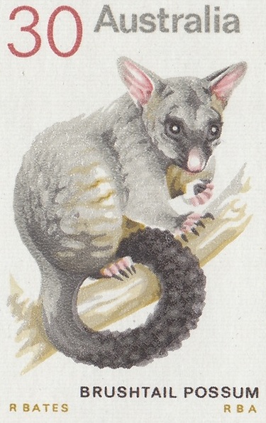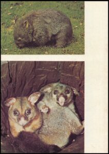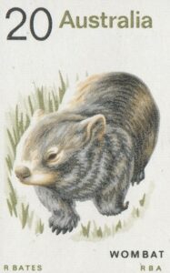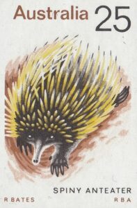 The Wombat and Brushtail Possum stamps were printed on the Rembrandt machine, and the other two on the Chambon machine. Sizes, including perfs., are: Wombat and Brushtail Possum 24.15 mm x 37.75 mm; Spiny Anteater and Feather-tailed Glider 25 mm x 37.5 mm. In each case, sheet content (as issued) is 100. All four stamps were designed by Mr. Richard Bates of Sydney who also designed the official first day cover associated with the issue. Mr. Bates drew the animals from live specimens at Mr. Eric Worrell’s Australian Reptile Park at Gosford, New South Wales. Mr. Worrell also assisted the artist with advice.