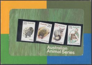 Four examples of Australia’s distinctive fauna are depicted on a new series of long-term definitive stamps issued by the Australian Post Office on 13th February, 1974. The values and subjects are: 20c Wombat, 25c Spiny Anteater, 30c Brushtail Possum and 75c Feather-tailed Glider.