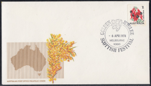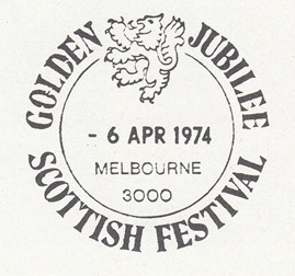 A pictorial postmarker was provided in Melbourne from 6th to 16th April, 1974, during the Golden Jubilee Scottish Festival, which commemorated the 50th anniversary of thye Victorian Highland Pipe Band Association. The organisation was formed at Geelong on 12 April, 1924, and is the oldest of its type in Australia. The postmarker design incorporates the Lion Rampant of Scotland. The postmarker was on 4,252 articles, including 10 registered.