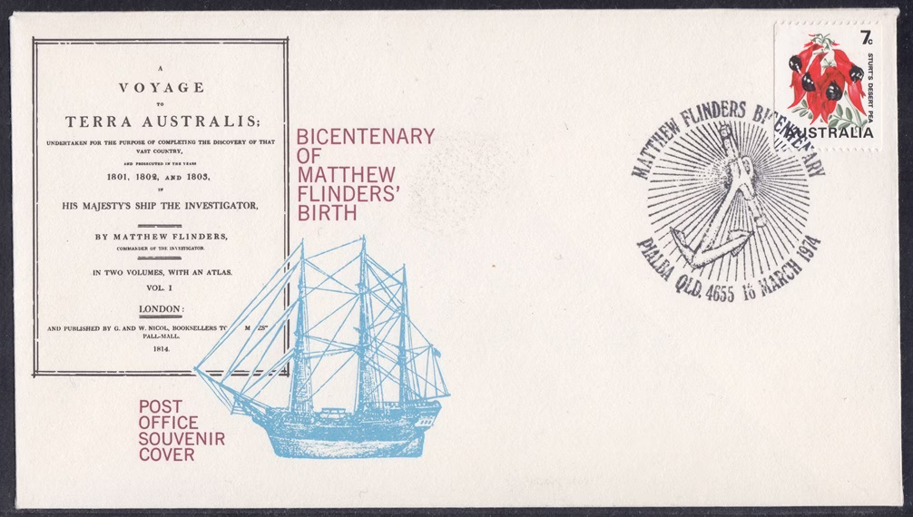 A souvenir cover and six pictorial postmarkers were provided on 16th March, 1974, to commemorate the bicentenary of the birth in Lincolnshire, England, of explorer Matthew Flinders (1774-1814).