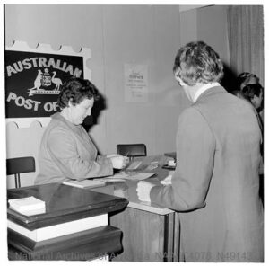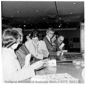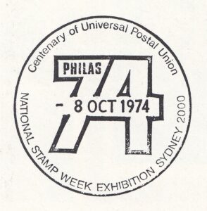 A pictorial postmarker was used at the temporary post office provided for the “Philas 74” National Stamp Week Exhibition held in Sydney between 8th and 11th October, 1974. The Philatelic Association of New South Wales organized an extensive philatelic display in the Blaxland Galleries located in the Farmer’s Department Store, Sydney, N.S.W. A total of 2,795 articles, including 70 registered, were cancelled with the special postmarker.