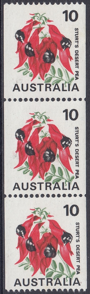 A new 10c coil definitive stamp, featuring the 7c Sturt’s Desert Pea design, modified to show the 10c denomination, was issued on 15th January, 1975.