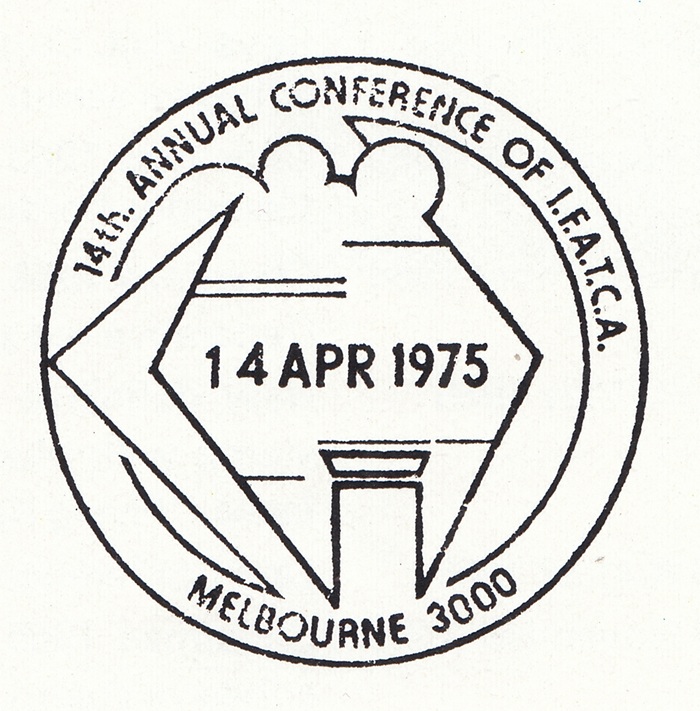 A special pictorial postmarker and a temporary post office were provided at the Melbourne Hilton Hotel during the 14th Annual Conference of the International Federation of Air Traffic Controllers’ Association, held from 14th to 18th April, 1975. The special cancellation was applied to a total of 4,016 articles including two registered.
