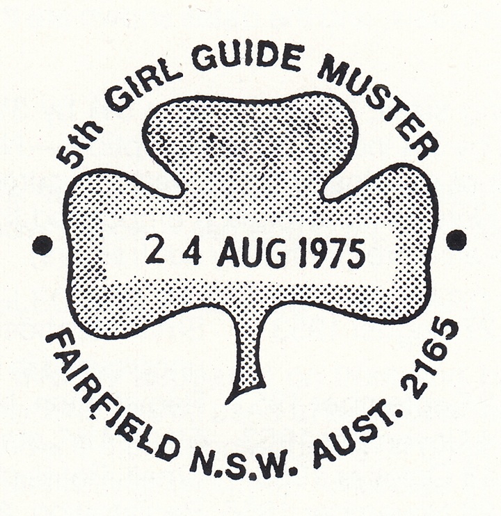A special postmarker at a temporary post office provided for the 5th Girl Guide Muster held at Fairfield, N.S.W., from 24th to 29th August, 1975, was used to process 5,720 articles, including 85 registered.