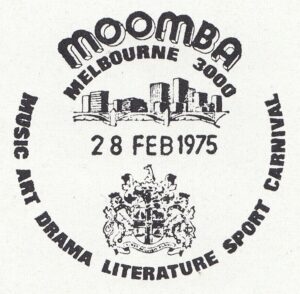 A pictorial postmarker and temporary post office were provided for the Moomba Festival, held in Melbourne between 28th February and 10th March, 1975; 8,437 articles, including 24 registered, were cancelled with the special postmarker.