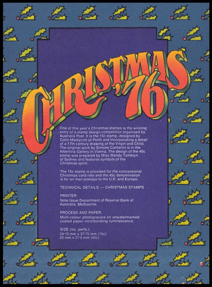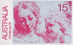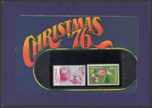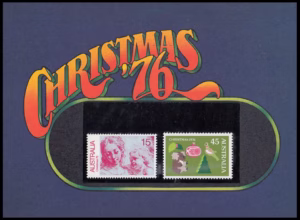 The Australian 1976 Christmas stamps of 15c and 45c values were issued on 1st November, 1976. The 15c stamp is the special postage rate introduced for standard size envelopes containing Christmas cards for delivery within Australia and endorsed “card only”; the rate applies only during November and December, 1976. The 45c rate is the air mail charge to Europe and United Kingdom for letters weighing up to 10 grams.