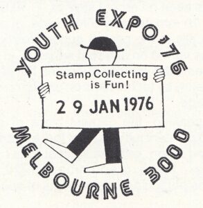 A pictorial postmarker was used at a temporary post office at the Exhibition Building to cancel 1,917 articles, including five registered, during Youth Expo ’76 held in Melbourne from 29th January to 2nd February, 1976.