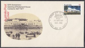 Australia Australia Philately: 1977 50th Anniversary Opening of Parliament House Canberra – First Day Covers No.100 & No.101 (ACT) thedigitalphilatelist 13/04/1977 2600 – CANBERRA PARLIAMENT HOUSE