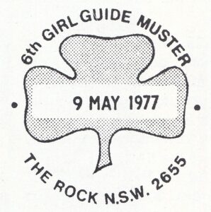 A total of 3,175 articles, including 159 registered were cancelled with a special postmarker provided at a temporary post office at The Rock Showgrounds, N.S.W., between 9th May to 15th May, 1977, for the Girl Guides State Muster.
