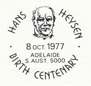 A total of 4,191 articles, including 47 registered, were cancelled with the special postmarker provided to commemorate the centenary of the birth of Sir Hans Heysen (1877-1968). The postmarker was in operation on 8 October 1977 at a temporary post office established at the South Australian Art Gallery.