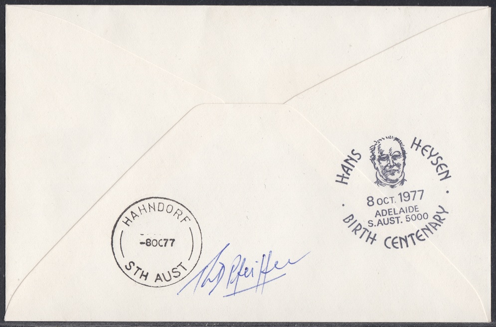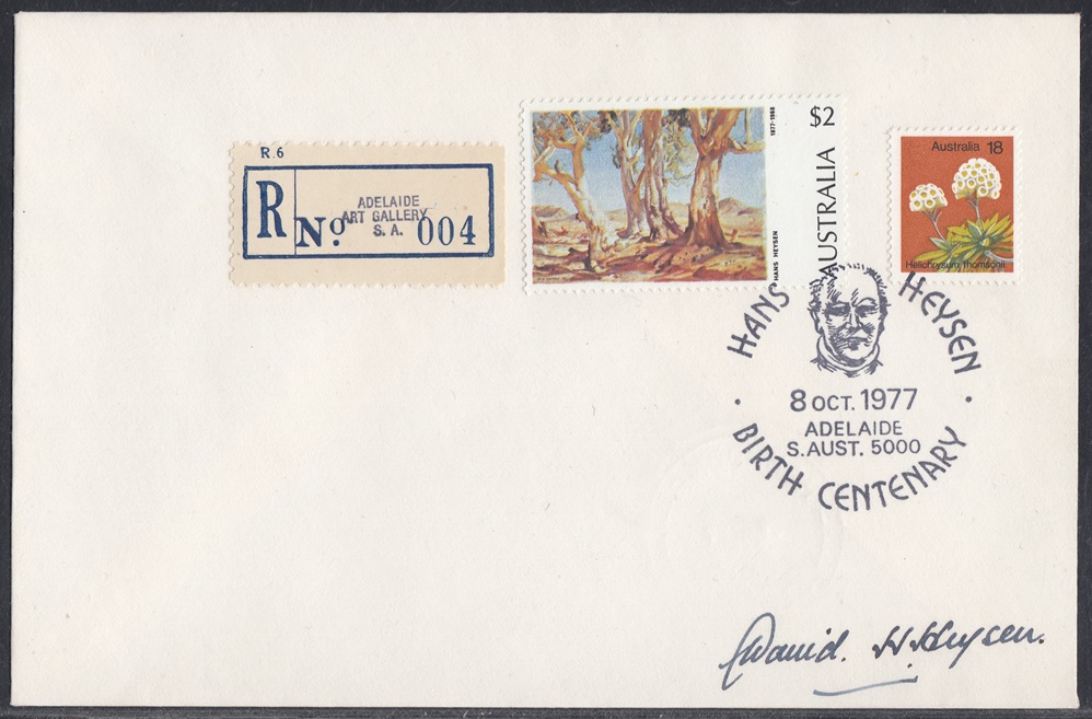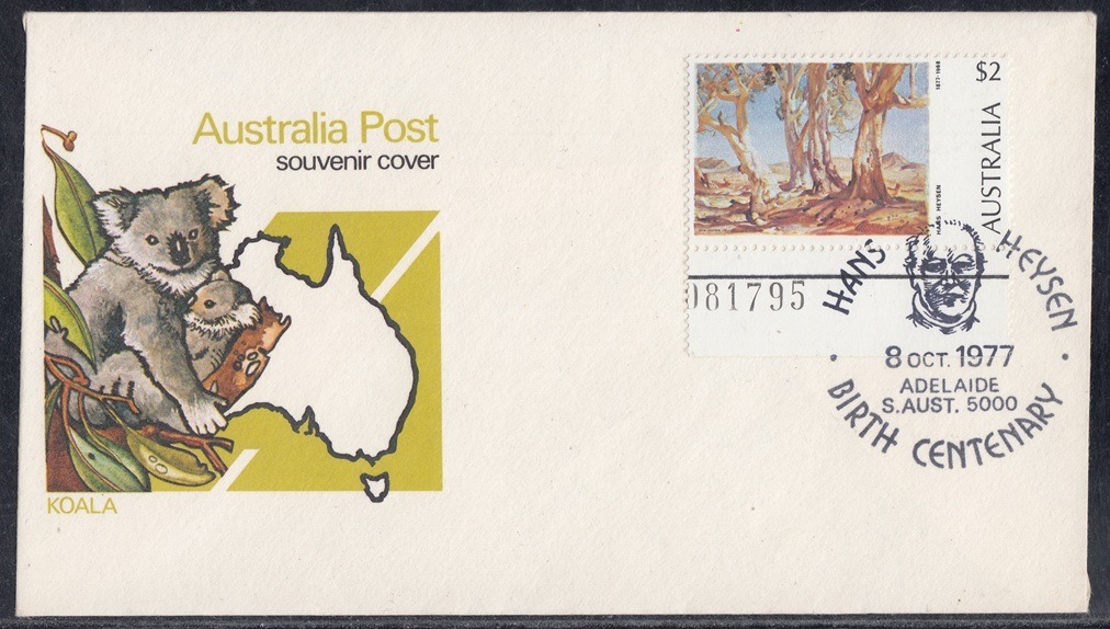 A total of 4,191 articles, including 47 registered, were cancelled with the special postmarker provided to commemorate the centenary of the birth of Sir Hans Heysen (1877-1968). The postmarker was in operation on 8 October 1977 at a temporary post office established at the South Australian Art Gallery.